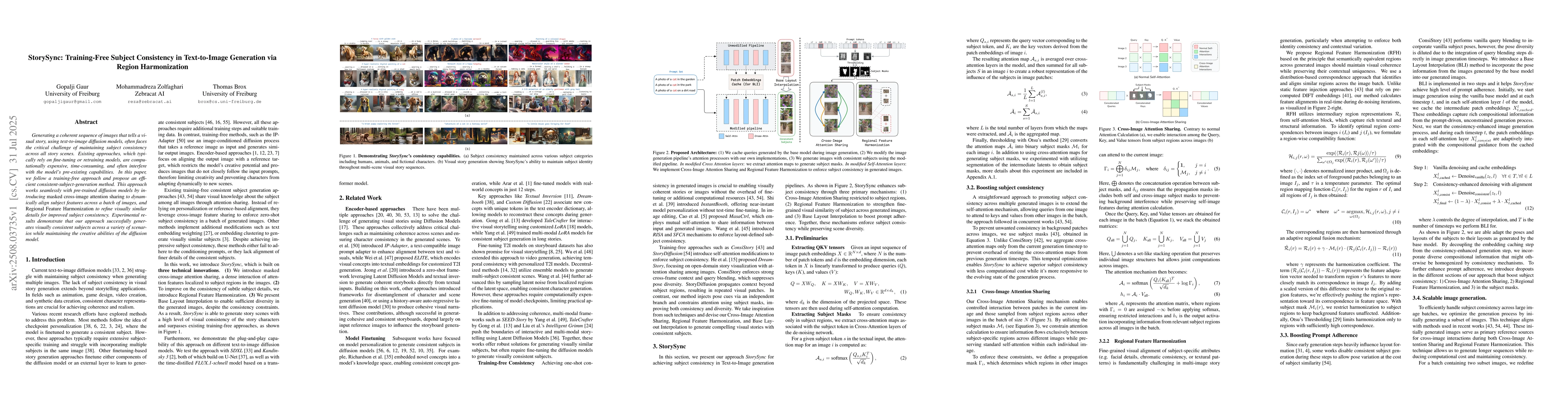 Generating a coherent sequence of images that tells a visual story, using text-to-image diffusion models, often faces the critical challenge of maintaining subject consistency across all story scenes. Existing approaches, which typically rely on fine-tuning or retraining models, are computationally expensive, time-consuming, and often interfere with the model's pre-existing capabilities. In this paper, we follow a training-free approach and propose an efficient consistent-subject-generation method. This approach works seamlessly with pre-trained diffusion models by introducing masked cross-image attention sharing to dynamically align subject features across a batch of images, and Regional Feature Harmonization to refine visually similar details for improved subject consistency. Experimental results demonstrate that our approach successfully generates visually consistent subjects across a variety of scenarios while maintaining the creative abilities of the diffusion model.