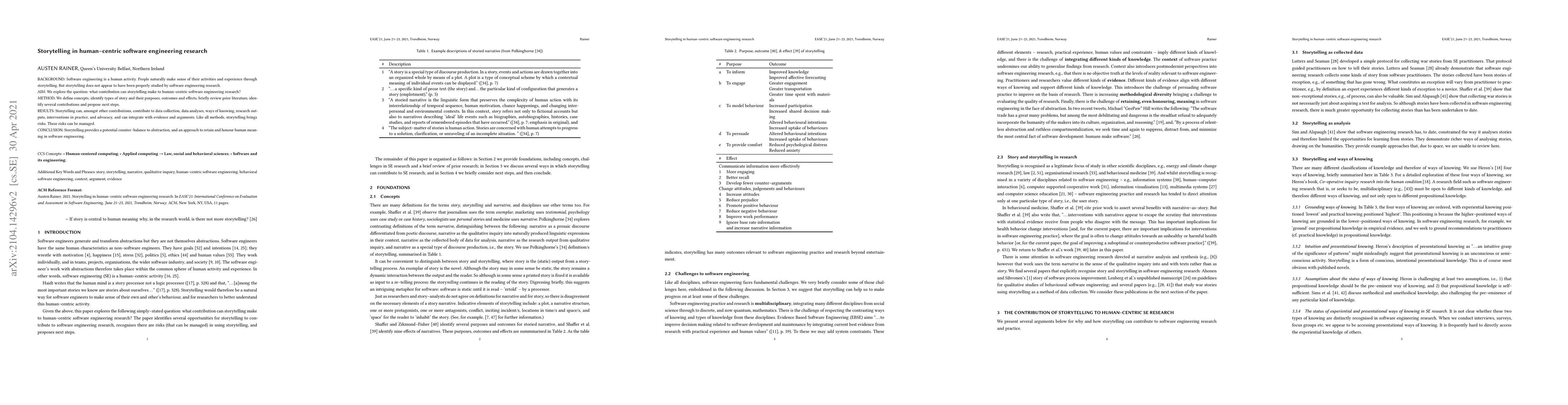 BACKGROUND: Software engineering is a human activity. People naturally make sense of their activities and experience through storytelling. But storytelling does not appear to have been properly studied by software engineering research. AIM: We explore the question: what contribution can storytelling make to human--centric software engineering research? METHOD: We define concepts, identify types of story and their purposes, outcomes and effects, briefly review prior literature, identify several contributions and propose next steps. RESULTS: Storytelling can, amongst other contributions, contribute to data collection, data analyses, ways of knowing, research outputs, interventions in practice, and advocacy, and can integrate with evidence and arguments. Like all methods, storytelling brings risks. These risks can be managed. CONCLUSION: Storytelling provides a potential counter--balance to abstraction, and an approach to retain and honour human meaning in software engineering.