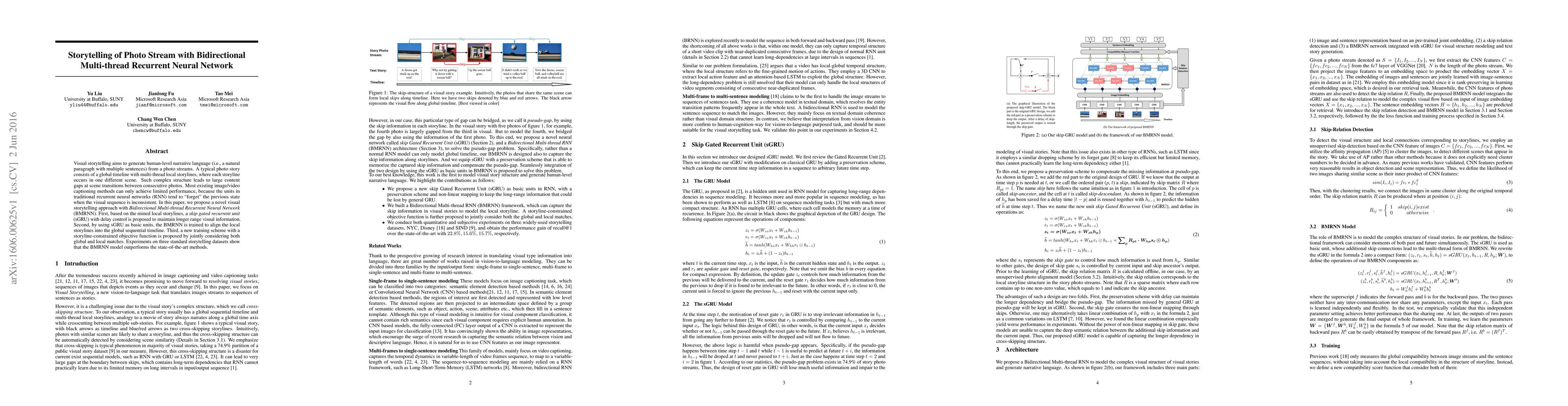 This paper proposes a Bidirectional Multi-thread Recurrent Neural Network (BMRNN) to generate coherent narrative language from photo streams, addressing the challenge of scene transitions. The BMRNN uses skip gated recurrent units with delay control to maintain long-range visual information and aligns local storylines into a global timeline, outperforming existing methods on storytelling datasets.