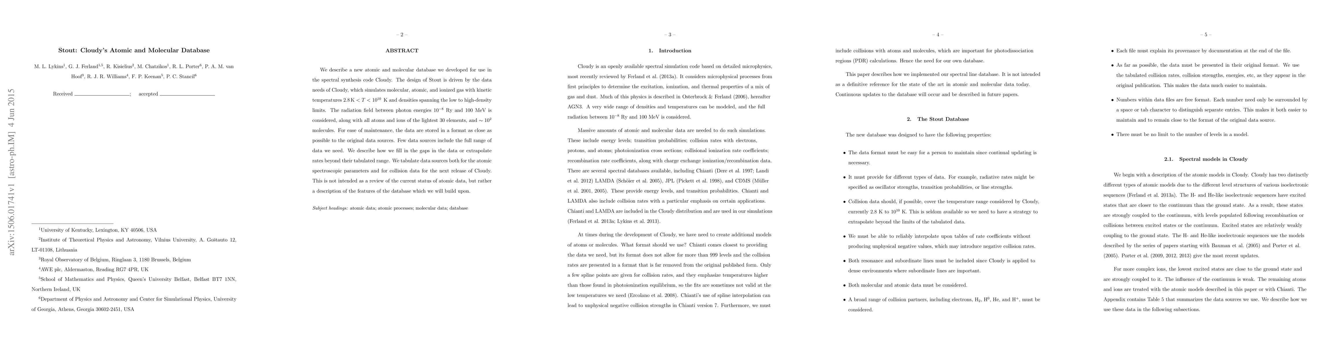 A new atomic and molecular database called Stout has been developed to support the spectral synthesis code Cloudy, covering a wide range of temperatures and densities with over 100 elements and molecules.