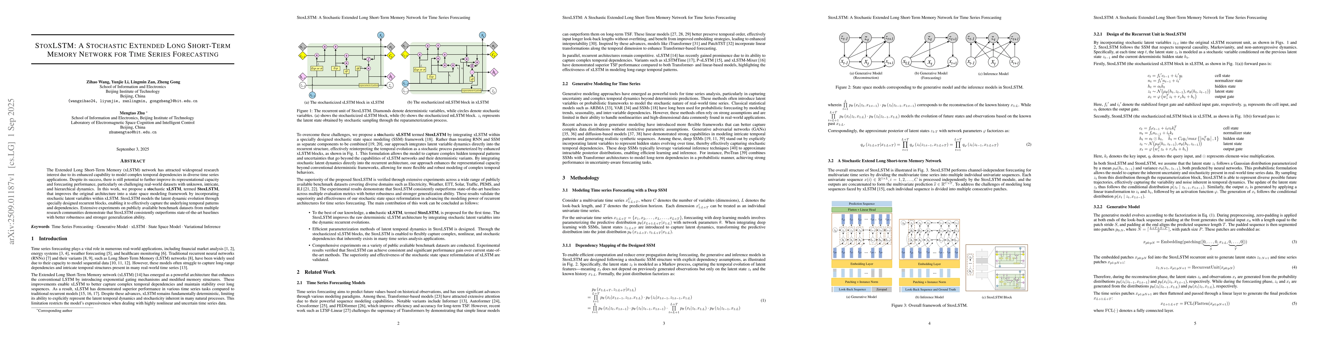 The Extended Long Short-Term Memory (xLSTM) network has attracted widespread research interest due to its enhanced capability to model complex temporal dependencies in diverse time series applications. Despite its success, there is still potential to further improve its representational capacity and forecasting performance, particularly on challenging real-world datasets with unknown, intricate, and hierarchical dynamics. In this work, we propose a stochastic xLSTM, termed StoxLSTM, that improves the original architecture into a state space modeling framework by incorporating stochastic latent variables within xLSTM. StoxLSTM models the latent dynamic evolution through specially designed recurrent blocks, enabling it to effectively capture the underlying temporal patterns and dependencies. Extensive experiments on publicly available benchmark datasets from multiple research communities demonstrate that StoxLSTM consistently outperforms state-of-the-art baselines with better robustness and stronger generalization ability.