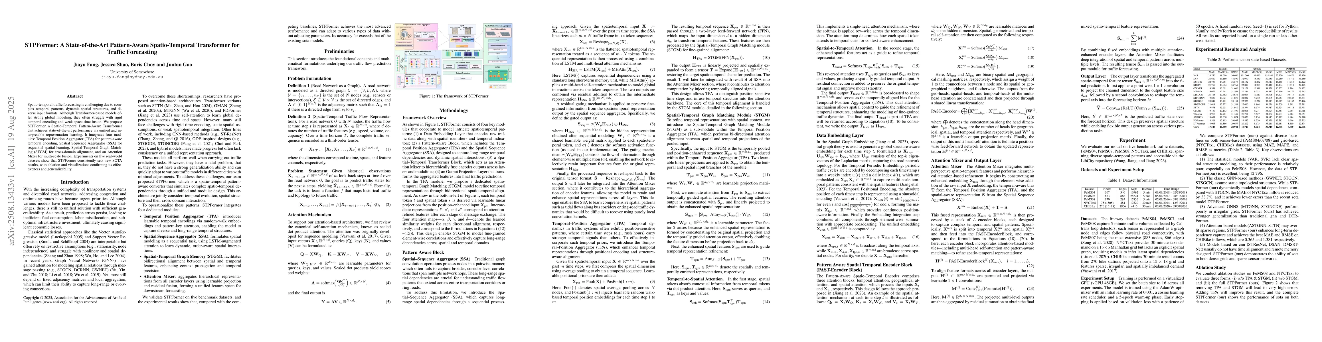 Spatio-temporal traffic forecasting is challenging due to complex temporal patterns, dynamic spatial structures, and diverse input formats. Although Transformer-based models offer strong global modeling, they often struggle with rigid temporal encoding and weak space-time fusion. We propose STPFormer, a Spatio-Temporal Pattern-Aware Transformer that achieves state-of-the-art performance via unified and interpretable representation learning. It integrates four modules: Temporal Position Aggregator (TPA) for pattern-aware temporal encoding, Spatial Sequence Aggregator (SSA) for sequential spatial learning, Spatial-Temporal Graph Matching (STGM) for cross-domain alignment, and an Attention Mixer for multi-scale fusion. Experiments on five real-world datasets show that STPFormer consistently sets new SOTA results, with ablation and visualizations confirming its effectiveness and generalizability.