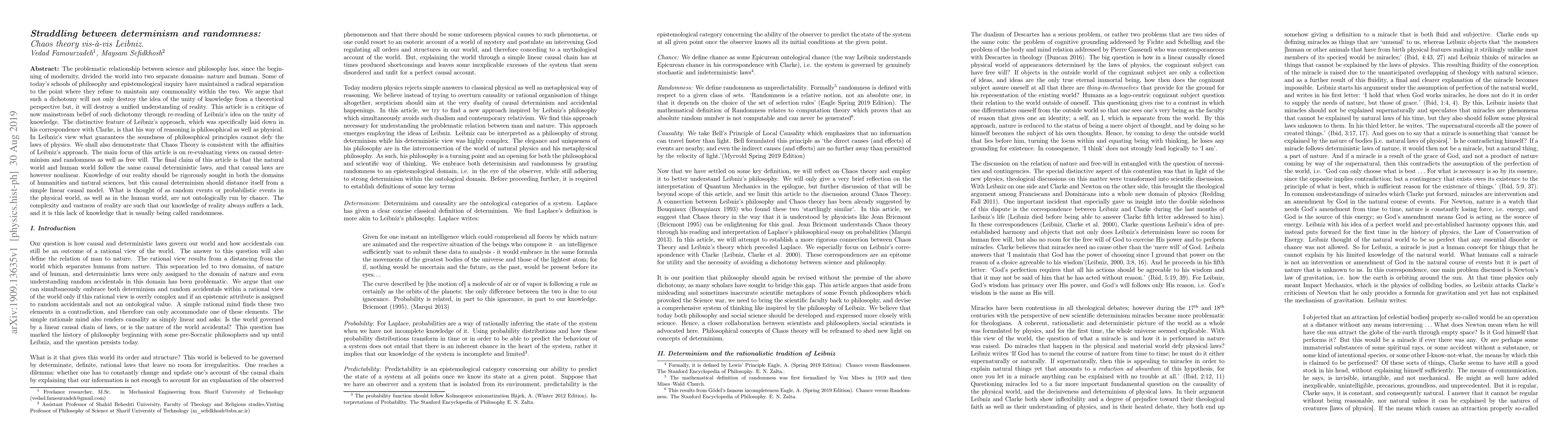 The problematic relationship between science and philosophy has, since the beginning of modernity, divided the world into two separate domains: nature and human. Some of today's schools of philosophy and epistemological inquiry have maintained a radical separation to the point where they refuse to maintain any commonality within the two. We argue that such a dichotomy will not only destroy the idea of the unity of knowledge from a theoretical perspective but, it will destroy a unified understanding of reality. This article is a critique of now mainstream belief of such dichotomy through re-reading of Leibniz's idea on the unity of knowledge. The distinctive feature of Leibniz's approach, which was specifically laid down in his correspondence with Clarke, is that his way of reasoning is philosophical as well as physical. In Leibniz's view what guarantees the soundness of philosophical principles cannot defy the laws of physics. We shall also demonstrate that Chaos Theory is consistent with the affinities of Leibniz's approach. The main focus of this article is on re-evaluating views on causal determinism and randomness as well as free will. The final claim of this article is that the natural world and human world follow the same causal deterministic laws, and that causal laws are however nonlinear. Knowledge of our reality should be rigorously sought in both the domains of humanities and natural sciences, but this causal determinism should distance itself from a simple linear causal model. What is thought of as random events or probabilistic events in the physical world, as well as in the human world, are not ontologically run by chance. The complexity and vastness of reality are such that our knowledge of reality always suffers a lack, and it is this lack of knowledge that is usually being called randomness.
