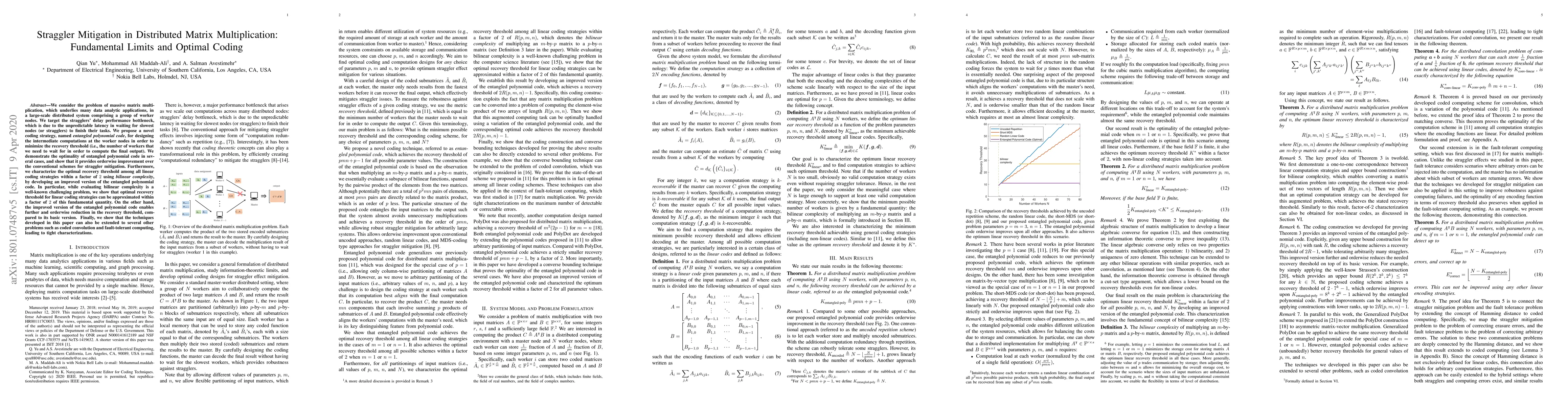 This research proposes an 'entangled polynomial code' to minimize delays caused by slow nodes (stragglers) in distributed matrix multiplication. It demonstrates that this code provides significant improvements over existing strategies and characterizes the optimal recovery threshold within a factor of 2 using 'bilinear complexity'. An improved version of the code further reduces the recovery threshold, and the techniques can be extended to other problems like coded convolution and fault-tolerant computing.