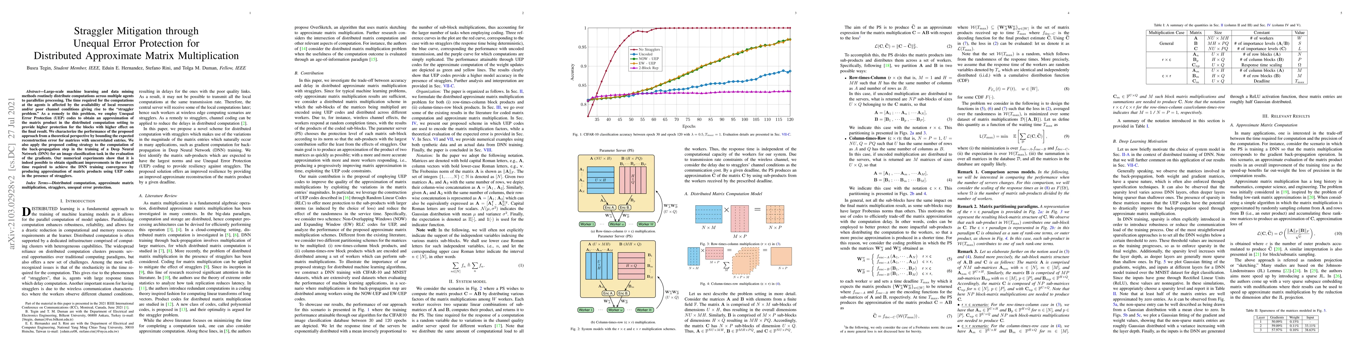 This paper proposes using Unequal Error Protection (UEP) codes to mitigate the straggler problem in distributed approximate matrix multiplication, improving computation efficiency. Theoretical analysis and practical application in DNN training show significant reductions in training time by prioritizing critical matrix blocks.