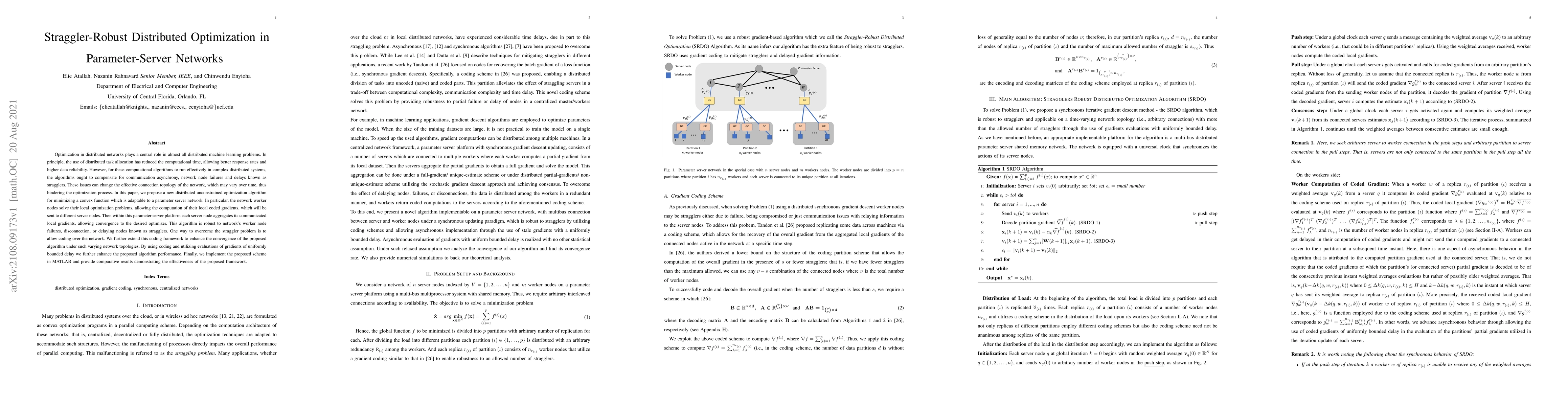 Optimization in distributed networks plays a central role in almost all distributed machine learning problems. In principle, the use of distributed task allocation has reduced the computational time, allowing better response rates and higher data reliability. However, for these computational algorithms to run effectively in complex distributed systems, the algorithms ought to compensate for communication asynchrony, network node failures and delays known as stragglers. These issues can change the effective connection topology of the network, which may vary over time, thus hindering the optimization process. In this paper, we propose a new distributed unconstrained optimization algorithm for minimizing a convex function which is adaptable to a parameter server network. In particular, the network worker nodes solve their local optimization problems, allowing the computation of their local coded gradients, which will be sent to different server nodes. Then within this parameter server platform each server node aggregates its communicated local gradients, allowing convergence to the desired optimizer. This algorithm is robust to network s worker node failures, disconnection, or delaying nodes known as stragglers. One way to overcome the straggler problem is to allow coding over the network. We further extend this coding framework to enhance the convergence of the proposed algorithm under such varying network topologies. By using coding and utilizing evaluations of gradients of uniformly bounded delay we further enhance the proposed algorithm performance. Finally, we implement the proposed scheme in MATLAB and provide comparative results demonstrating the effectiveness of the proposed framework
