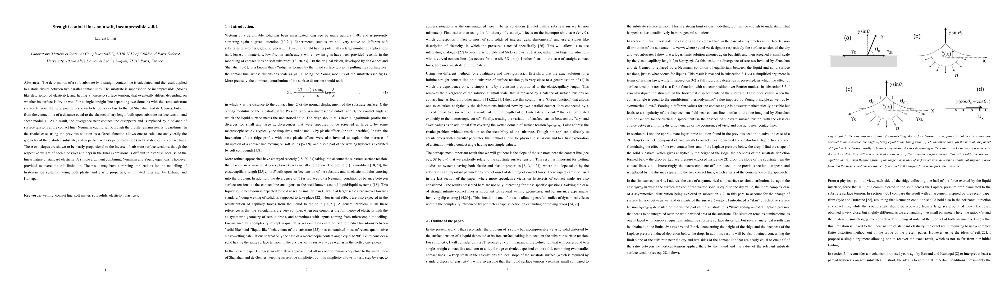 Researchers study how a soft, incompressible solid interacts with straight contact lines, finding that surface tensions play a crucial role in determining the shape of the substrate near the contact line, with implications for modeling hysteresis in complex systems.