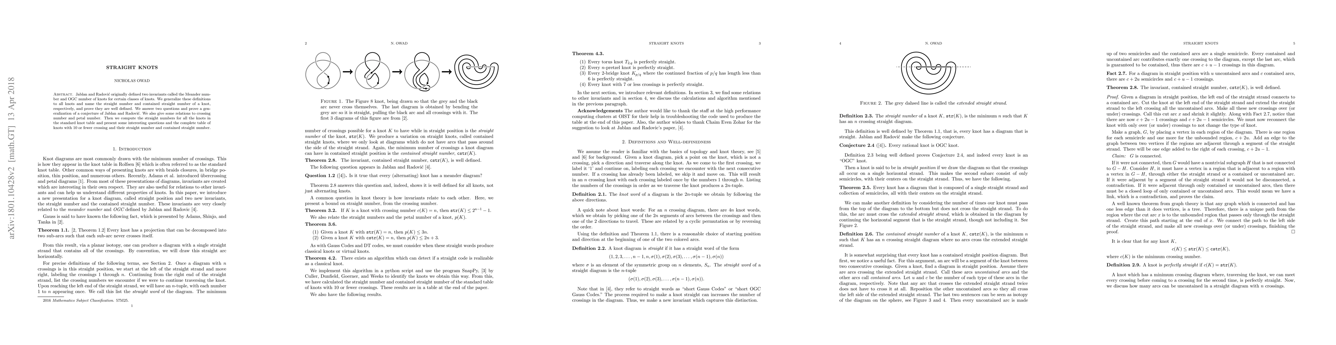Jablan and Radovi\'c originally defined two invariants called the Meander number and OGC number of knots for certain classes of knots. We generalize these definitions to all knots and name the straight number and contained straight number of a knot, respectively, and prove they are well defined. We answer two questions and prove a generalization of a conjecture of Jablan and Radovi\'c. We also give some relations to crossing number and petal number. Then we compute the straight numbers for all the knots in the standard knot table and present some interesting questions and the complete table of knots with 10 or fewer crossing and their straight number and contained straight number.