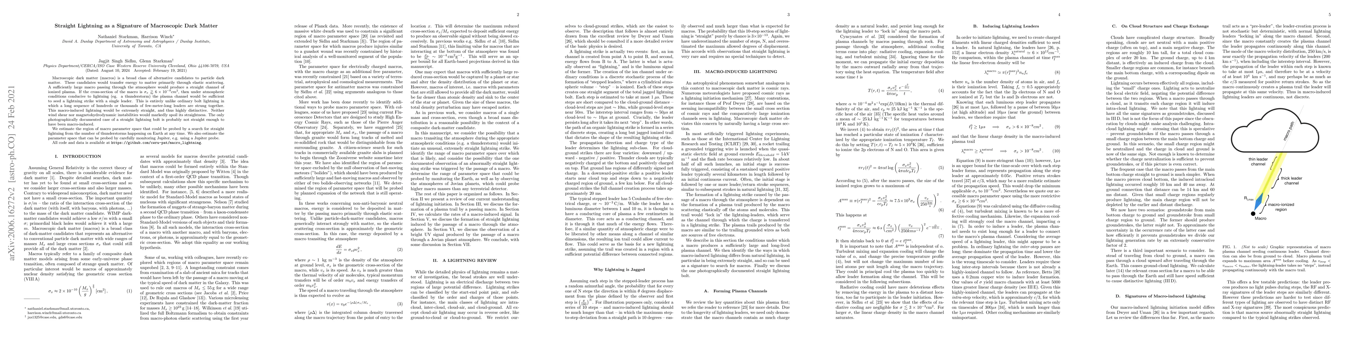 A new type of lightning, called straight lightning, is proposed as a signature of macroscopic dark matter, which could be detectable through its unique straight channel of ionized plasma.