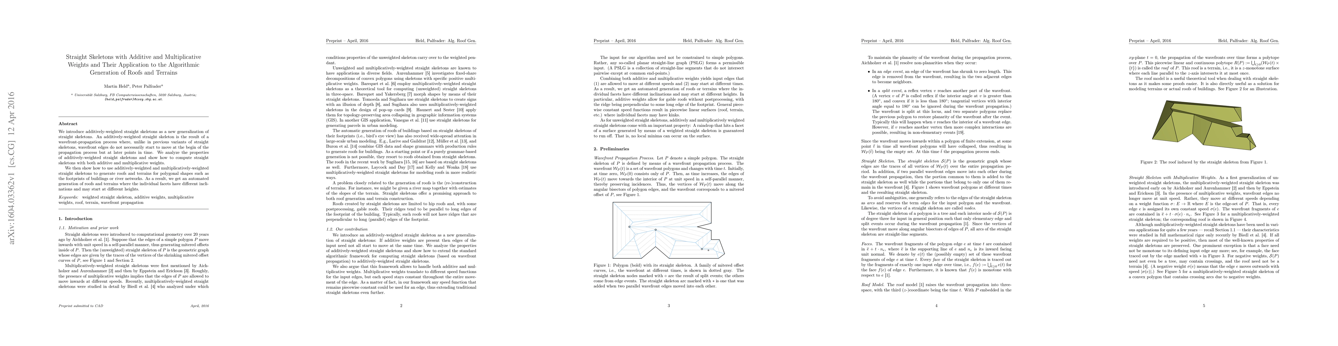 We introduce additively-weighted straight skeletons as a new generalization of straight skeletons. An additively-weighted straight skeleton is the result of a wavefront-propagation process where, unlike in previous variants of straight skeletons, wavefront edges do not necessarily start to move at the begin of the propagation process but at later points in time. We analyze the properties of additively-weighted straight skeletons and show how to compute straight skeletons with both additive and multiplicative weights. We then show how to use additively-weighted and multiplicatively-weighted straight skeletons to generate roofs and terrains for polygonal shapes such as the footprints of buildings or river networks. As a result, we get an automated generation of roofs and terrains where the individual facets have different inclinations and may start at different heights.