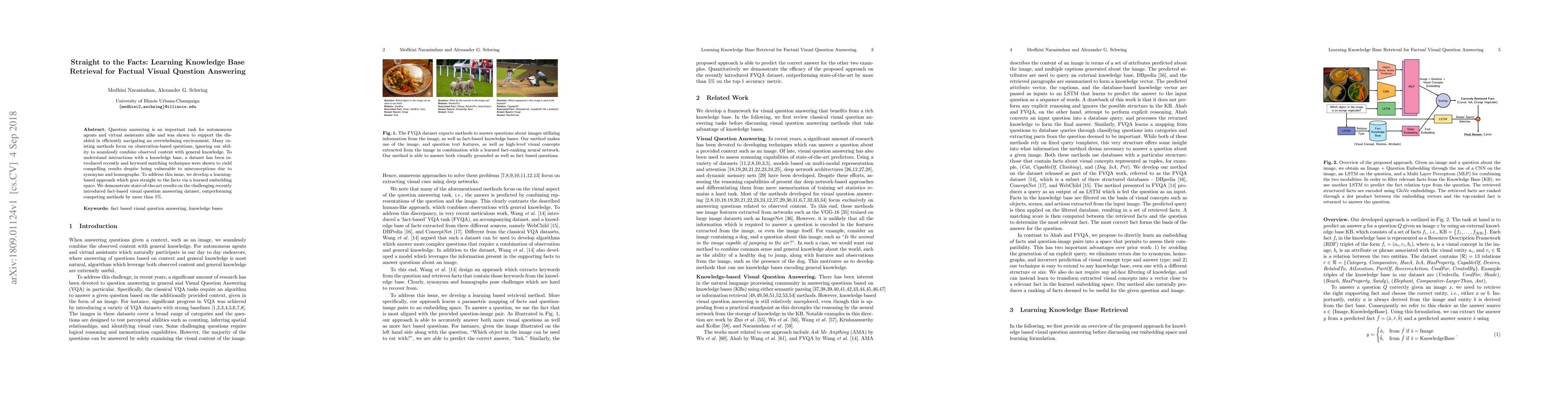 Question answering is an important task for autonomous agents and virtual assistants alike and was shown to support the disabled in efficiently navigating an overwhelming environment. Many existing methods focus on observation-based questions, ignoring our ability to seamlessly combine observed content with general knowledge. To understand interactions with a knowledge base, a dataset has been introduced recently and keyword matching techniques were shown to yield compelling results despite being vulnerable to misconceptions due to synonyms and homographs. To address this issue, we develop a learning-based approach which goes straight to the facts via a learned embedding space. We demonstrate state-of-the-art results on the challenging recently introduced fact-based visual question answering dataset, outperforming competing methods by more than 5%.