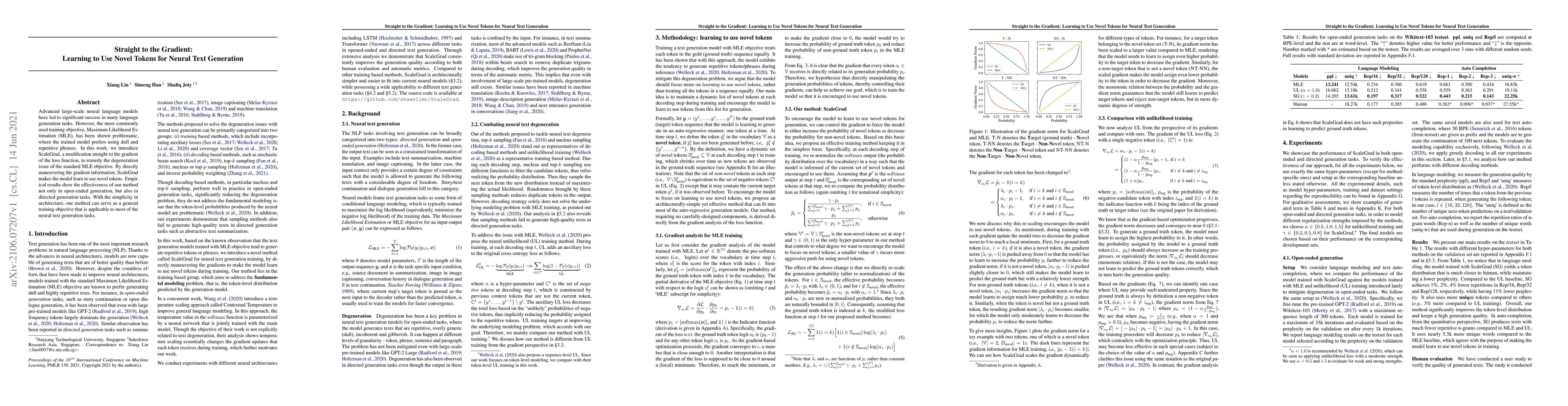A new training objective called ScaleGrad is introduced to improve large-scale neural language models' ability to use novel tokens in text generation tasks. This method has shown effectiveness in both open-ended and directed generation tasks.