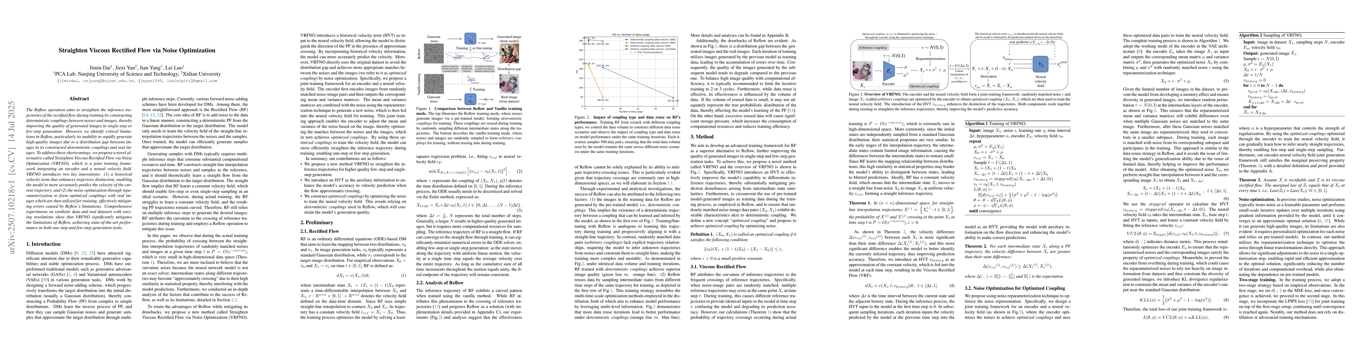 The Reflow operation aims to straighten the inference trajectories of the rectified flow during training by constructing deterministic couplings between noises and images, thereby improving the quality of generated images in single-step or few-step generation. However, we identify critical limitations in Reflow, particularly its inability to rapidly generate high-quality images due to a distribution gap between images in its constructed deterministic couplings and real images. To address these shortcomings, we propose a novel alternative called Straighten Viscous Rectified Flow via Noise Optimization (VRFNO), which is a joint training framework integrating an encoder and a neural velocity field. VRFNO introduces two key innovations: (1) a historical velocity term that enhances trajectory distinction, enabling the model to more accurately predict the velocity of the current trajectory, and (2) the noise optimization through reparameterization to form optimized couplings with real images which are then utilized for training, effectively mitigating errors caused by Reflow's limitations. Comprehensive experiments on synthetic data and real datasets with varying resolutions show that VRFNO significantly mitigates the limitations of Reflow, achieving state-of-the-art performance in both one-step and few-step generation tasks.