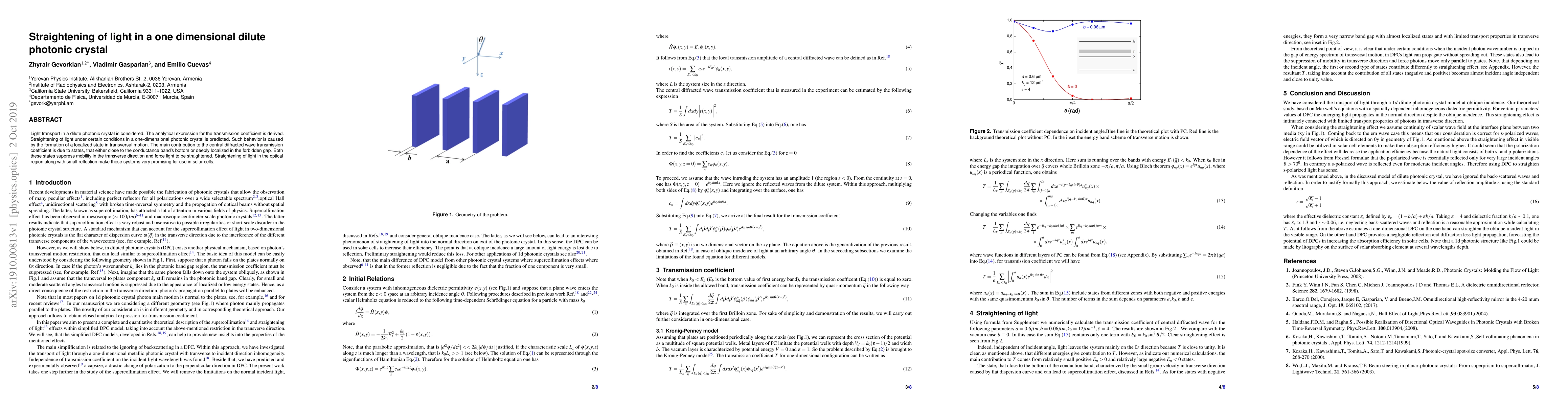 This paper investigates light transport in a one-dimensional dilute photonic crystal, deriving an analytical expression for the transmission coefficient and predicting light straightening under specific conditions due to localized states. Such behavior, driven by states near conductance bands or within the forbidden gap, enhances the potential of these systems for solar cell applications.