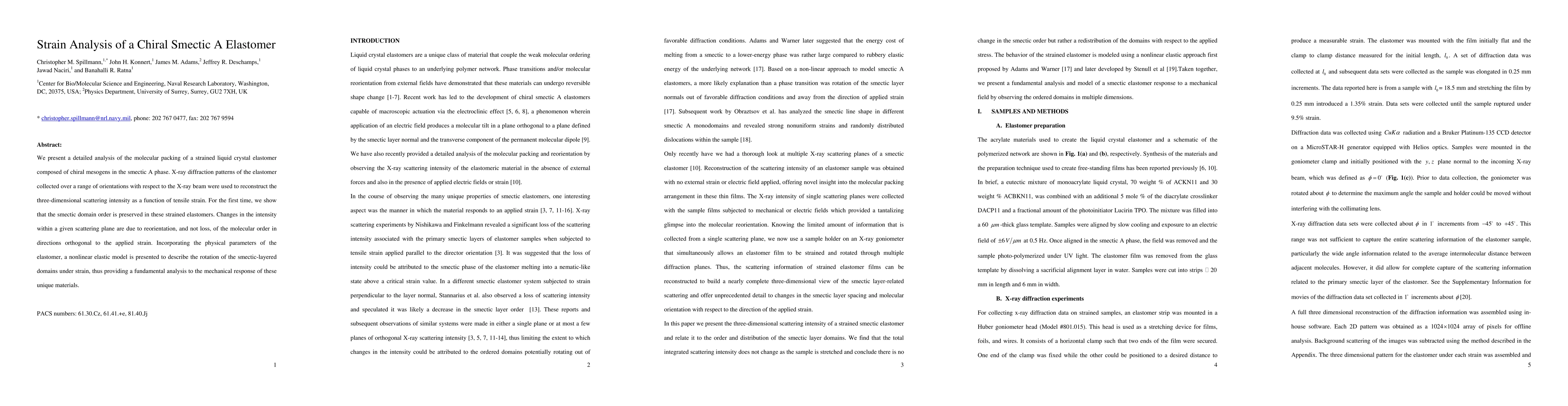 This study analyzes the molecular packing of a chiral smectic A elastomer under tensile strain using X-ray diffraction, revealing preserved smectic domain order despite deformation. A nonlinear elastic model is proposed to describe the rotation of smectic layers, offering insight into the mechanical behavior of these materials.
