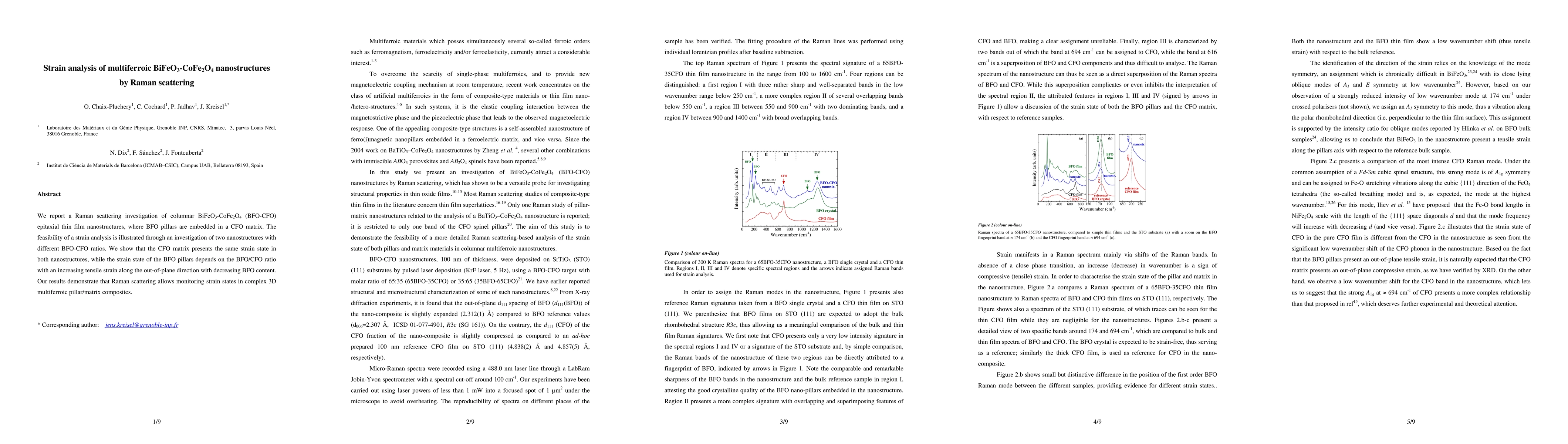 We report a Raman scattering investigation of columnar BiFeO3-CoFe2O4 (BFO-CFO) epitaxial thin film nanostructures, where BFO pillars are embedded in a CFO matrix. The feasibility of a strain analysis is illustrated through an investigation of two nanostructures with different BFO-CFO ratios. We show that the CFO matrix presents the same strain state in both nanostructures, while the strain state of the BFO pillars depends on the BFO/CFO ratio with an increasing tensile strain along the out-of-plane direction with decreasing BFO content. Our results demonstrate that Raman scattering allows monitoring strain states in complex 3D multiferroic pillar/matrix composites.