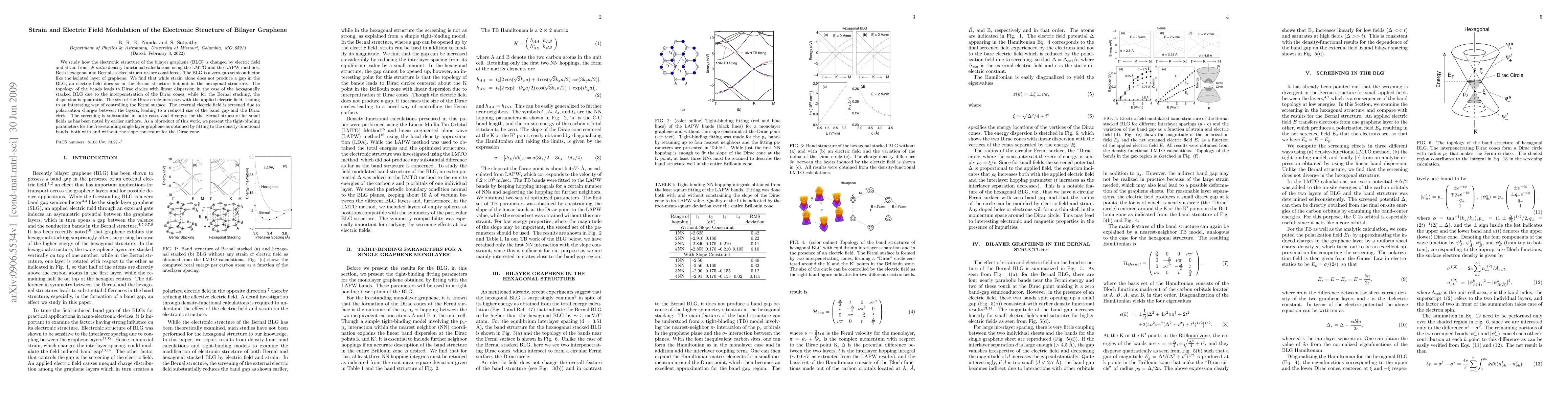 This paper investigates the electronic structure of bilayer graphene under strain and electric field using density-functional calculations, finding that an electric field induces a band gap in Bernal-stacked BLG but not in hexagonal-stacked BLG. The study also highlights the impact of electric field screening on the Fermi surface and provides tight-binding parameters for single-layer graphene.