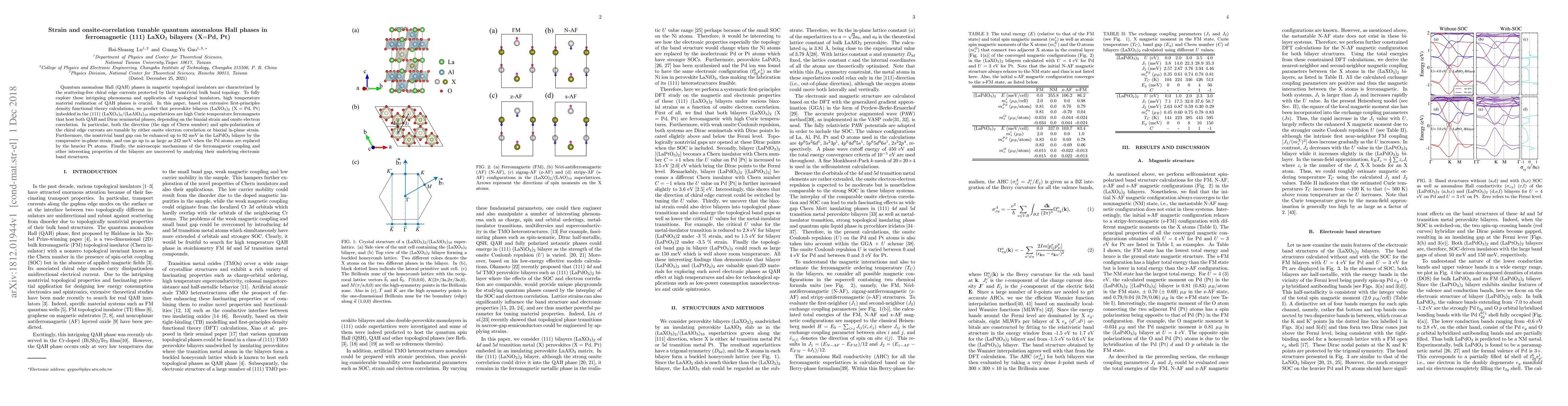 Quantum anomalous Hall (QAH) phases in magnetic topological insulators are characterized by the scattering-free chiral edge currents protected by their nontrivial bulk band topology. To fully explore these intriguing phenomena and application of topological insulators, high temperature material realization of QAH phases is crucial. In this paper, based on extensive first-principles density functional theory calculations, we predict that perovskite bilayers (LaXO$_3$)$_{2}$ (X = Pd, Pt) imbedded in the (111) (LaXO$_3$)$_{2}$/(LaAlO$_3$)$_{10}$ superlattices are high Curie temperature ferromagnets that host both QAH and Dirac semimetal phases, depending on the biaxial strain and onsite electron correlation. In particular, both the direction (the sign of Chern number) and spin-polarization of the chiral edge currents are tunable by either onsite electron correlation or biaxial in-plane strain. Furthermore, the nontrivial band gap can be enhanced up to 92 meV in the LaPdO$_3$ bilayer by the compressive in-plane strain, and can go up to as large as 242 meV when the Pd atoms are replaced by the heavier Pt atoms. Finally, the microscopic mechanisms of the ferromagnetic coupling and other interesting properties of the bilayers are uncovered by analyzing their underlying electronic band structures.