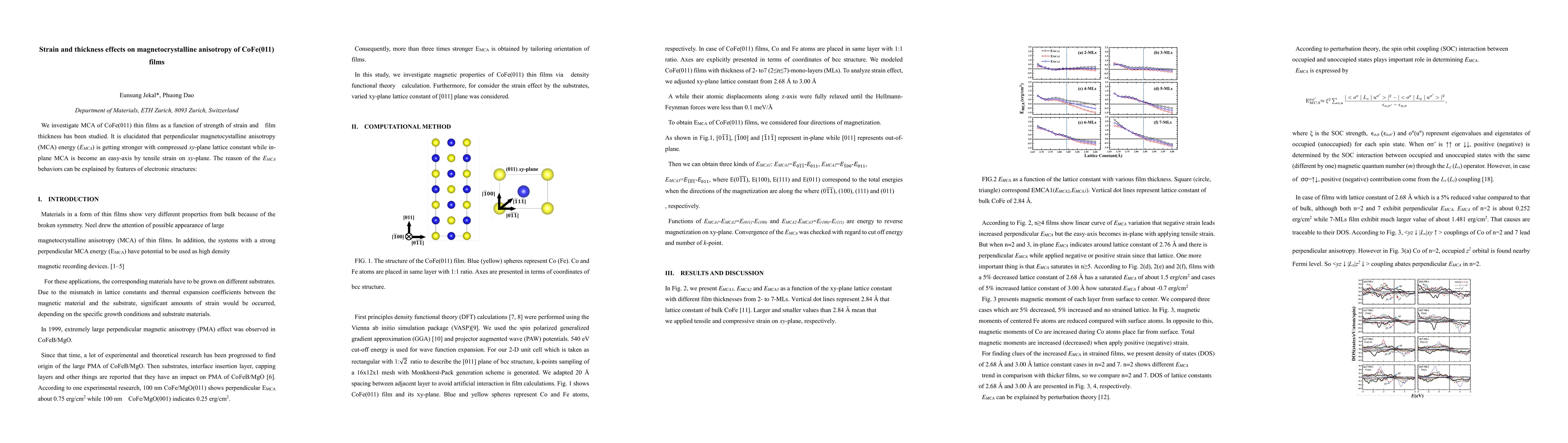 Summary: This study examines how strain and film thickness influence the magnetocrystalline anisotropy (MCA) of CoFe(011) films, revealing that compressed strain enhances perpendicular MCA while tensile strain makes in-plane MCA the easy axis, with electronic structure features explaining these behaviors.