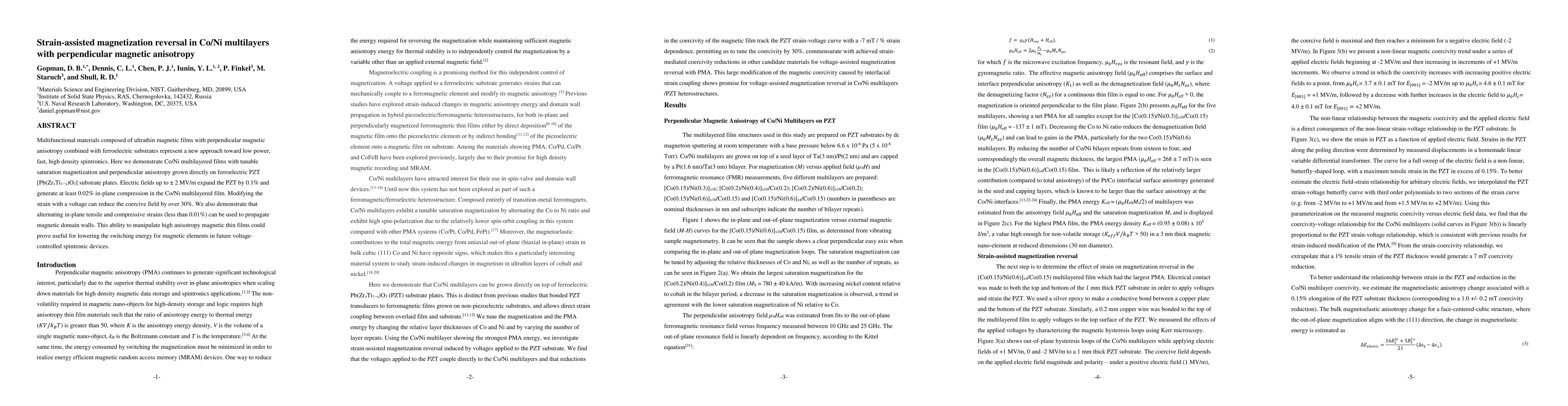 This paper investigates Co/Ni multilayer films with perpendicular magnetic anisotropy on ferroelectric PZT substrates, showing that strain induced by electric fields can significantly reduce the coercive field and facilitate domain wall propagation, potentially lowering switching energy in future spintronic devices.