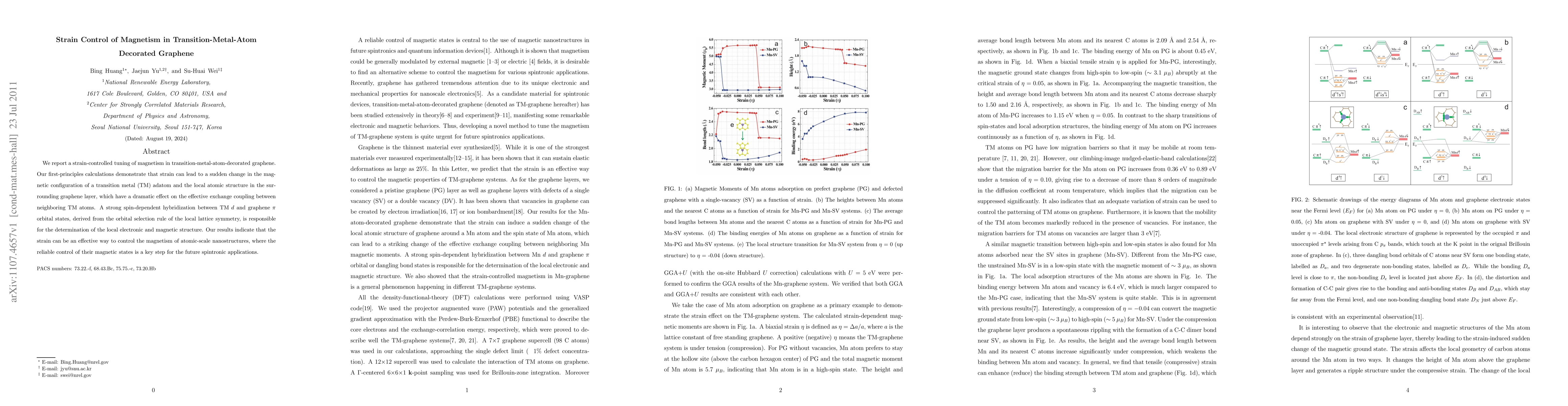 This paper demonstrates that strain can significantly alter the magnetism of transition-metal-decorated graphene by changing the magnetic configuration and local atomic structure, influencing the exchange coupling between neighboring atoms. The strong spin-dependent hybridization between the metal and graphene layers under strain is key to controlling the magnetic properties, highlighting strain as a potential method for future spintronic applications.