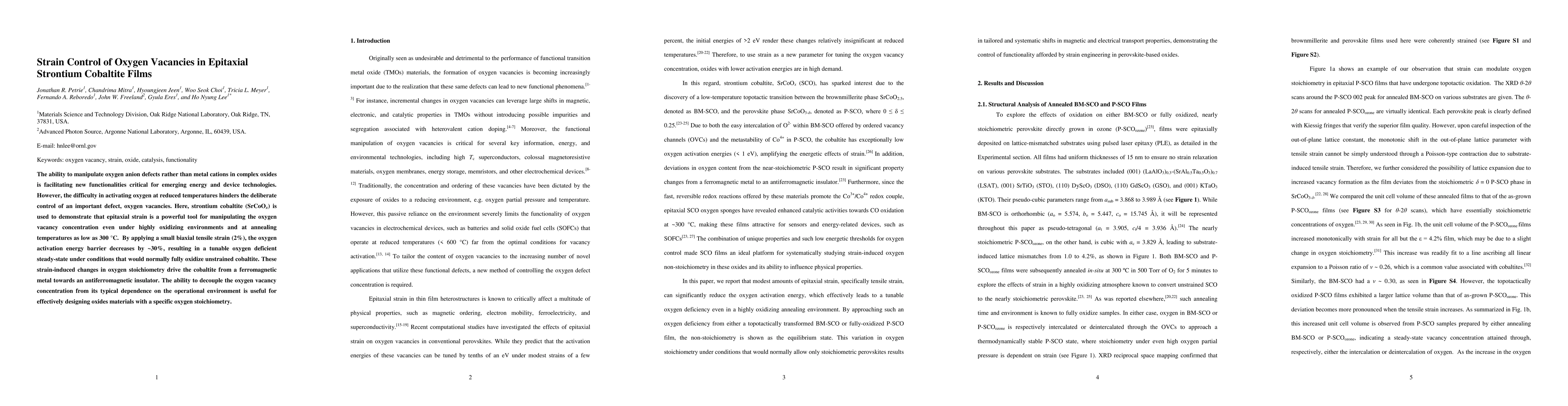 This paper demonstrates that epitaxial strain can effectively manipulate oxygen vacancy concentration in strontium cobaltite films at low temperatures, enabling new functionalities in oxide materials. The study shows that a small tensile strain reduces the oxygen activation energy barrier, allowing for tunable oxygen deficiency and altering the material's magnetic properties from ferromagnetic to antiferromagnetic.