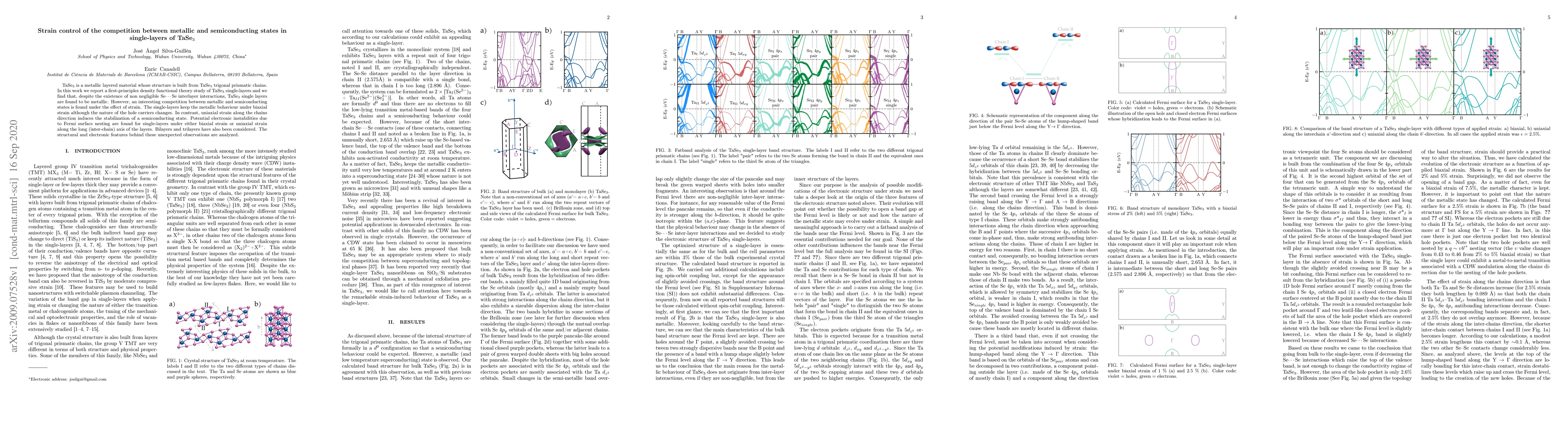 TaSe$_3$ is a metallic layered material whose structure is built from TaSe$_3$ trigonal prismatic chains. In this work we report a first-principles density functional theory study of TaSe$_3$ single-layers and we find that, despite the existence of non negligible Se...Se interlayer interactions, TaSe$_3$ single layers are found to be metallic. However, an interesting competition between metallic and semiconducting states is found under the effect of strain. The single-layers keep the metallic behaviour under biaxial strain although the nature of the hole carriers changes. In contrast, uniaxial strain along the chains direction induces the stabilization of a semiconducting state. Potential electronic instabilities due to Fermi surface nesting are found for single-layers under either biaxial strain or uniaxial strain along the long (inter-chain) axis of the layers. Bilayers and trilayers have also been considered. The structural and electronic features behind these unexpected observations are analyzed.