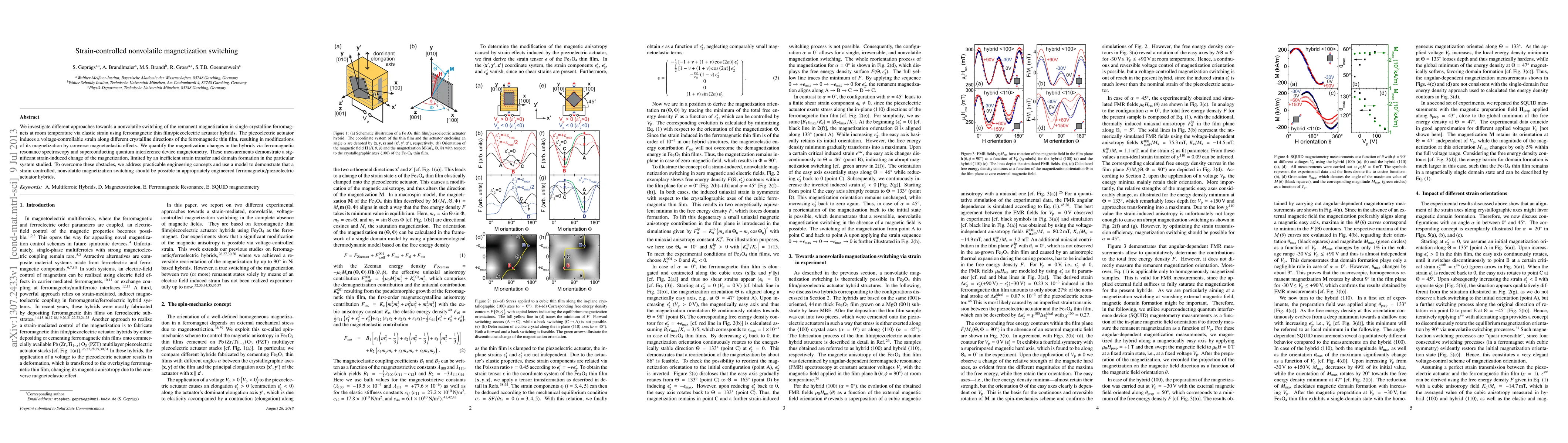 We investigate different approaches towards a nonvolatile switching of the remanent magnetization in single-crystalline ferromagnets at room temperature via elastic strain using ferromagnetic thin film/piezoelectric actuator hybrids. The piezoelectric actuator induces a voltage-controllable strain along different crystalline directions of the ferromagnetic thin film, resulting in modifications of its magnetization by converse magnetoelastic effects. We quantify the magnetization changes in the hybrids via ferromagnetic resonance spectroscopy and superconducting quantum interference device magnetometry. These measurements demonstrate a significant strain-induced change of the magnetization, limited by an inefficient strain transfer and domain formation in the particular system studied. To overcome these obstacles, we address practicable engineering concepts and use a model to demonstrate that a strain-controlled, nonvolatile magnetization switching should be possible in appropriately engineered ferromagnetic/piezoelectric actuator hybrids.