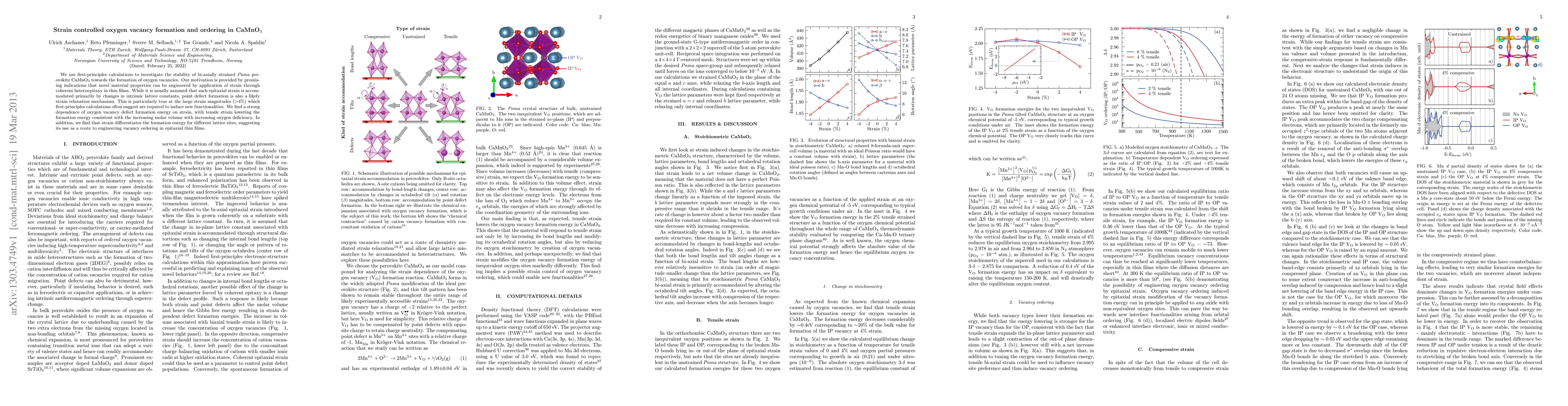 This paper uses first-principles calculations to show that biaxial strain significantly influences the formation of oxygen vacancies in CaMnO$_3$, with tensile strain lowering the formation energy. The study also suggests that strain can be used to engineer vacancy ordering in epitaxial thin films.