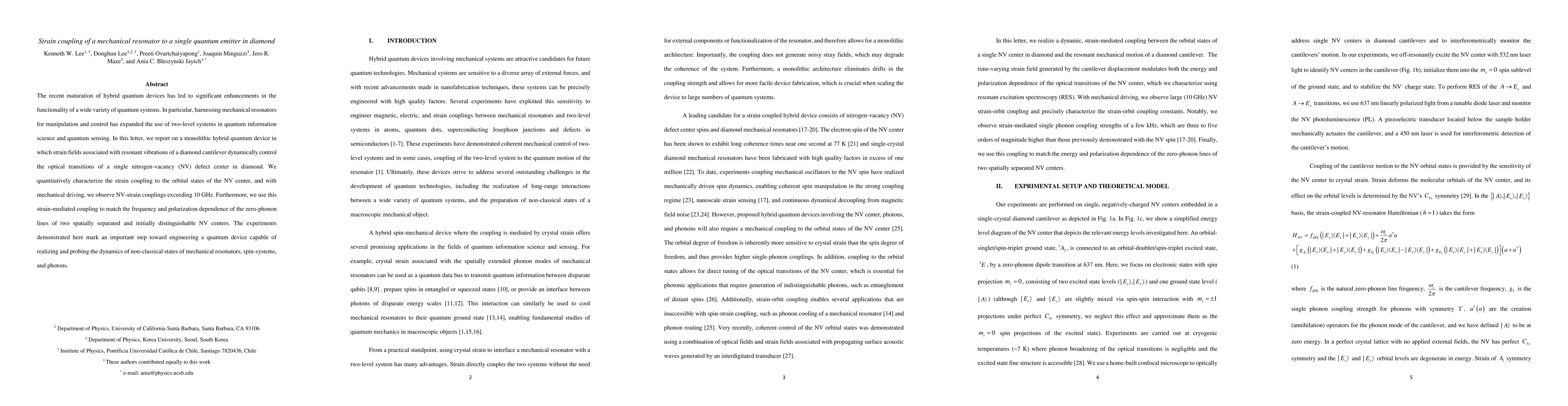 This paper reports on a hybrid quantum device where mechanical resonators in diamond cantilevers dynamically control the optical transitions of nitrogen-vacancy centers, achieving strain couplings exceeding 10 GHz. The study demonstrates strain-mediated coupling between two NV centers, marking progress toward quantum devices for manipulating non-classical states.
