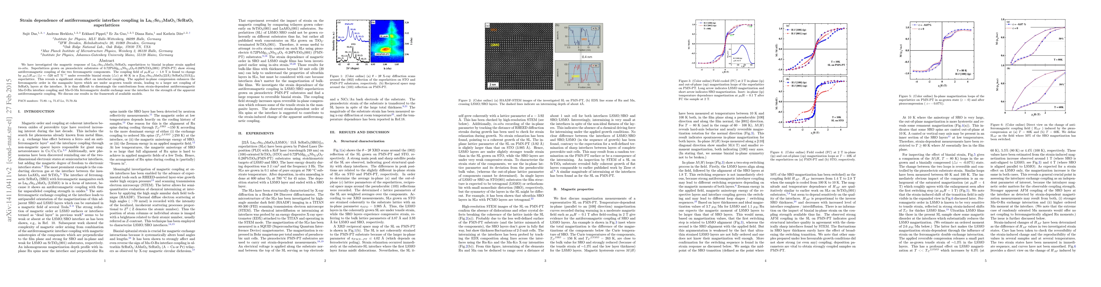 This study investigates the magnetic response of La0.7Sr0.3MnO3/SrRuO3 superlattices under biaxial in-plane strain, revealing a significant strain effect on antiferromagnetic coupling. The coupling field decreases by approximately -520 mT/% under reversible strain, indicating that the applied compression enhances the ferromagnetic order in the manganite layers.