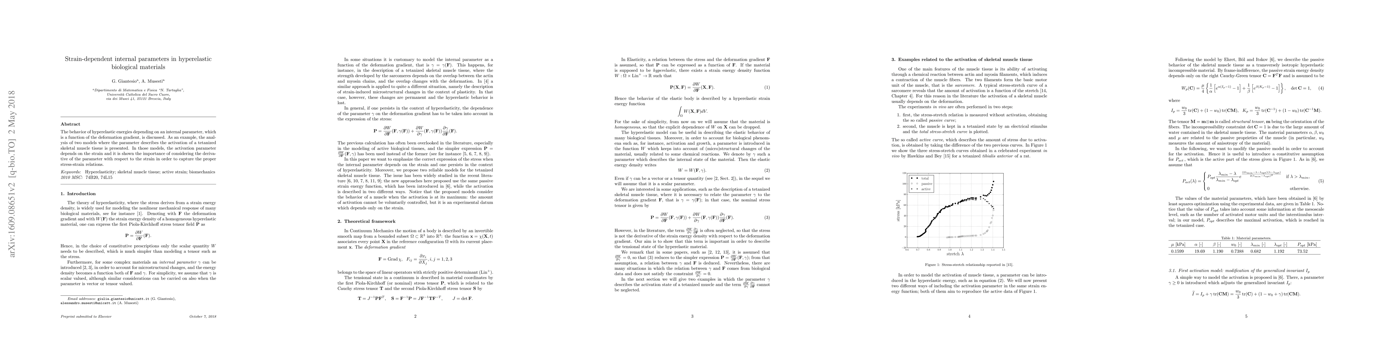 This paper investigates how internal parameters in hyperelastic biological materials, specifically tetanized skeletal muscle tissue, affect energy behaviors under deformation. It highlights the necessity of considering the strain-dependent derivative of the activation parameter to accurately model stress-strain relationships.