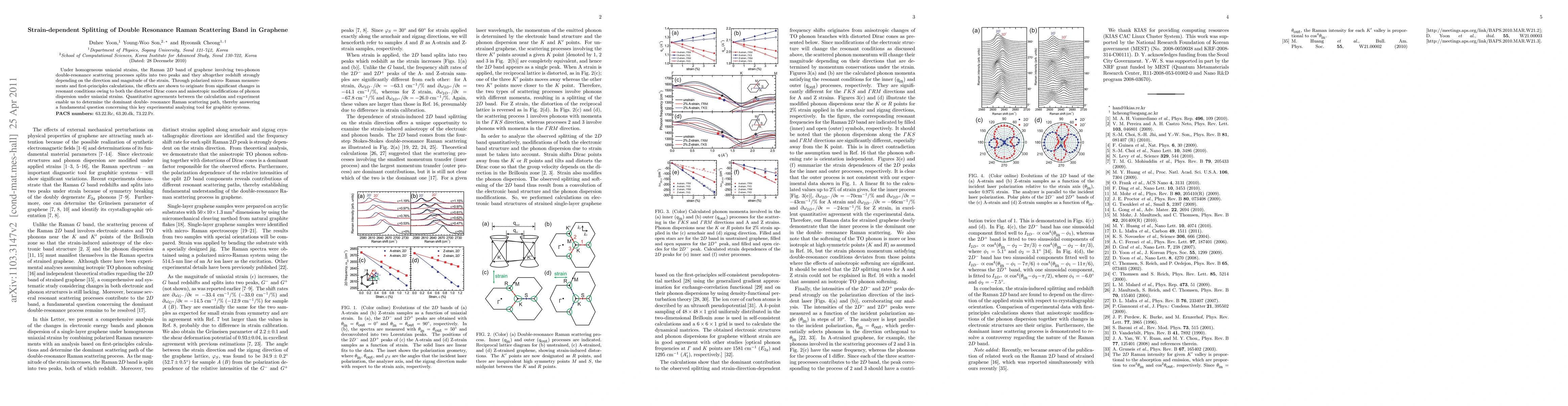 This study reveals that uniaxial strains induce splitting and redshift in the Raman 2D band of graphene due to changes in resonant conditions from distorted Dirac cones and phonon dispersion modifications. Experimental and theoretical analyses confirm these strain-dependent effects and identify the dominant double-resonance Raman scattering path.
