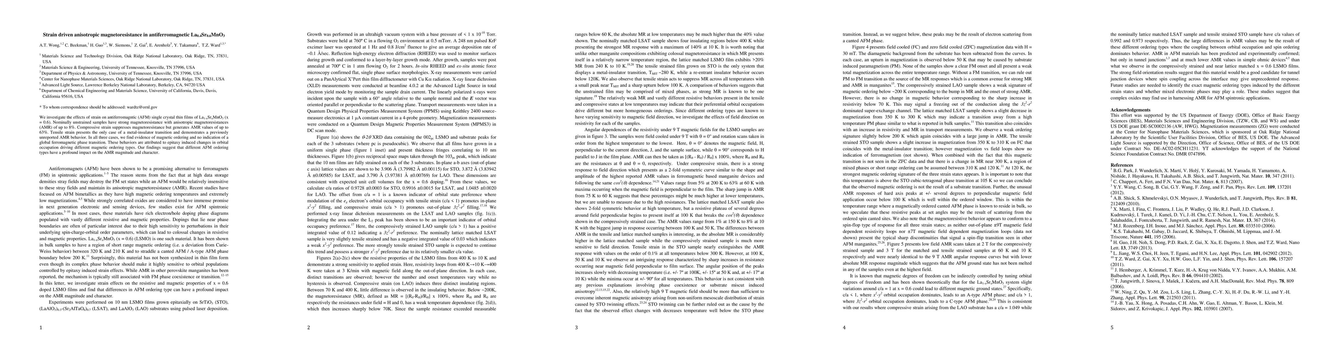 We investigate the effects of strain on antiferromagntic (AFM) single crystal thin films of La$_{1-x}$Sr$_{x}$MnO$_{3}$ (x = 0.6). Nominally unstrained samples have strong magnetoresistance with anisotropic magnetoresistances (AMR) of up to 8%. Compressive strain suppresses magnetoresistance but generates AMR values of up to 63%. Tensile strain presents the only case of a metal-insulator transition and demonstrates a previously unreported AMR behavior. In all three cases, we find evidence of magnetic ordering and no indication of a global ferromagnetic phase transition. These behaviors are attributed to epitaxy induced changes in orbital occupation driving different magnetic ordering types. Our findings suggest that different AFM ordering types have a profound impact on the AMR magnitude and character.