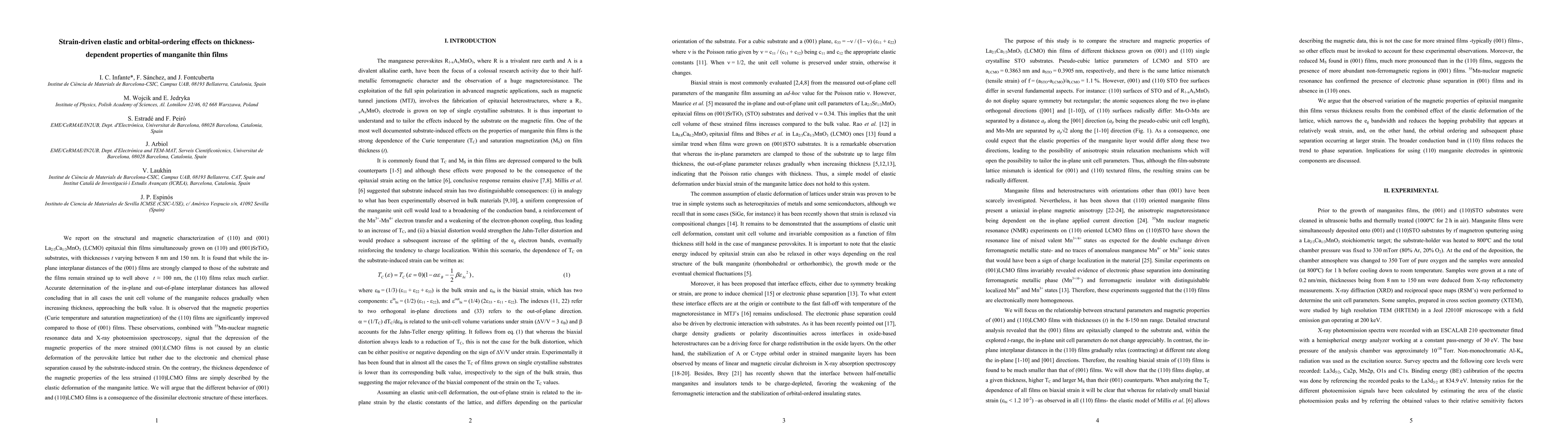 We report on the structural and magnetic characterization of (110) and (001) La2/3Ca1/3MnO3 (LCMO) epitaxial thin films simultaneously grown on (110) and (001)SrTiO3 substrates, with thicknesses t varying between 8 nm and 150 nm. It is found that while the in-plane interplanar distances of the (001) films are strongly clamped to those of the substrate and the films remain strained up to well above t=100 nm, the (110) films relax much earlier. Accurate determination of the in-plane and out-of-plane interplanar distances has allowed concluding that in all cases the unit cell volume of the manganite reduces gradually when increasing thickness, approaching the bulk value. It is observed that the magnetic properties (Curie temperature and saturation magnetization) of the (110) films are significantly improved compared to those of (001) films. These observations, combined with 55Mn-nuclear magnetic resonance data and X-ray photoemission spectroscopy, signal that the depression of the magnetic properties of the more strained (001)LCMO films is not caused by an elastic deformation of the perovskite lattice but rather due to the electronic and chemical phase separation caused by the substrate-induced strain. On the contrary, the thickness dependence of the magnetic properties of the less strained (110)LCMO films are simply described by the elastic deformation of the manganite lattice. We will argue that the different behavior of (001) and (110)LCMO films is a consequence of the dissimilar electronic structure of these interfaces.