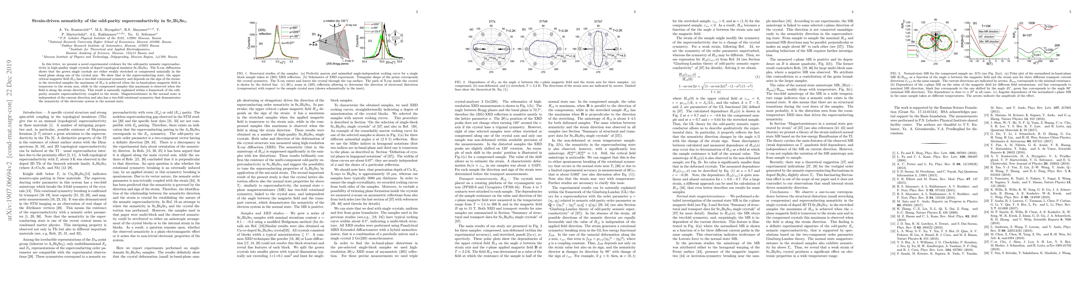 We present a novel experimental evidence for the odd-parity nematic superconductivity in high-quality single crystals of doped topological insulator Sr$_x$Bi$_2$Se$_3$. The X-ray diffraction shows that the grown single crystals are either weakly stretched or compressed uniaxially in the basal plane along one of the crystal axis. We show that in the superconducting state, the upper critical magnetic field $H_{c2}$ has a two-fold rotational symmetry and depends on the sign of the strain: in the stretched samples, the maximum of $H_{c2}$ is achieved when the in-plane magnetic field is transverse to the strain axis, while in the compressed samples this maximum is observed when the field is along the strain direction. This result is naturally explained within a framework of the odd-parity nematic superconductivity coupled to the strain. Magnetoresistance in the normal state is independent of the current direction and also has a two-fold rotational symmetry that demonstrates the nematicity of the electronic system in the normal state.