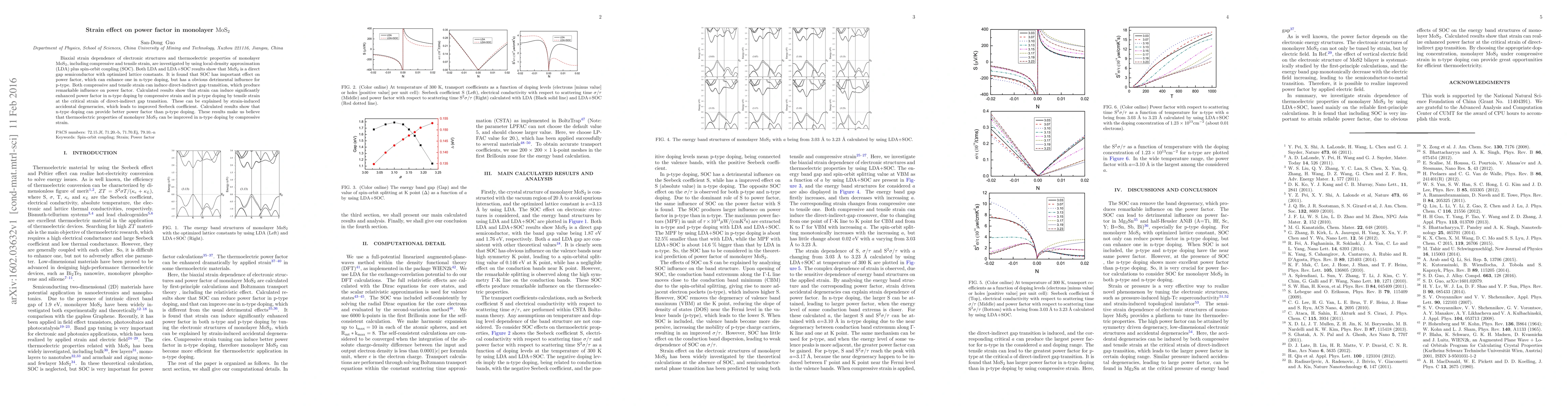 This paper investigates the impact of biaxial strain on the electronic structures and thermoelectric properties of monolayer $\mathrm{MoS_2}$, finding that spin-orbit coupling significantly affects power factor differently in n-type and p-type doping. Compressive strain enhances power factor in n-type, while tensile strain does so in p-type, suggesting potential for improved thermoelectric performance in n-doped $\mathrm{MoS_2}$.