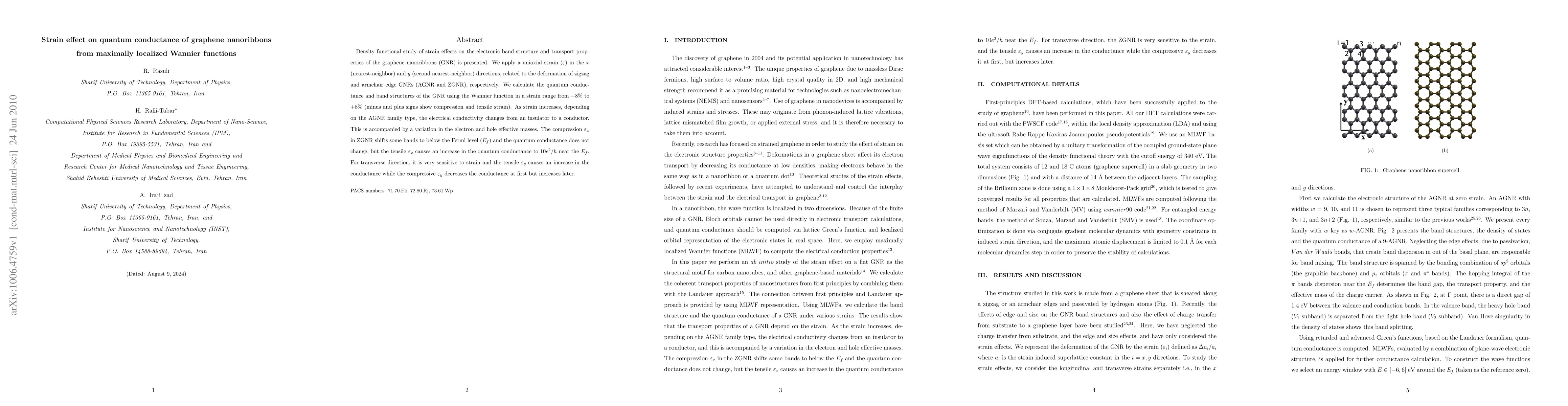 This study investigates the impact of uniaxial strain on the electronic band structure and quantum conductance of graphene nanoribbons using maximally localized Wannier functions. The research reveals that strain can transform armchair graphene nanoribbons from insulators to conductors, while zigzag graphene nanoribbons exhibit increased quantum conductance under tensile strain, especially near the Fermi level.