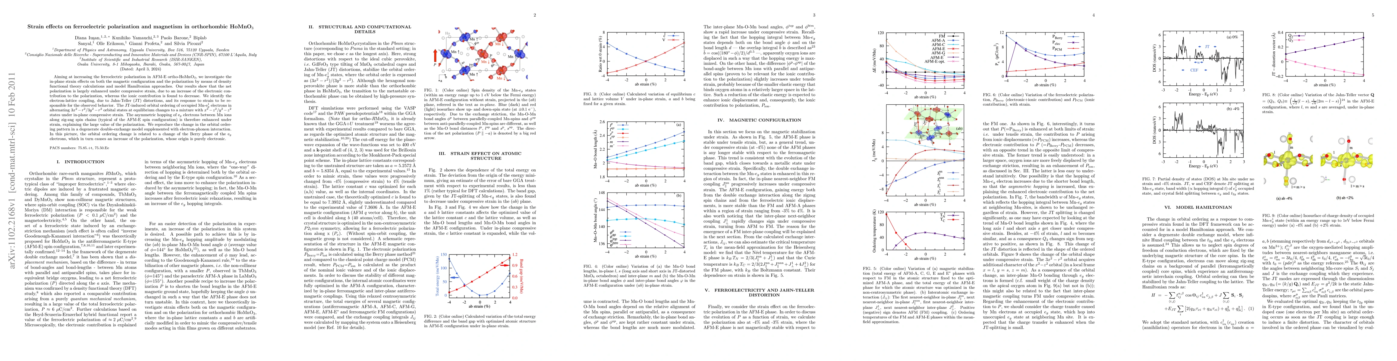 Aiming at increasing the ferroelectric polarization in AFM-E ortho-\hmo, we investigate the in-plane strain effects on both the magnetic configuration and the polarization by means of density functional theory calculations and model Hamiltonian approaches. Our results show that the net polarization is largely enhanced under compressive strain, due to an increase of the electronic contribution to the polarization, whereas the ionic contribution is found to decrease. We identify the electron-lattice coupling, due to Jahn-Teller (JT) distortions, and its response to strain to be responsible for the observed behavior. The JT-induced orbital ordering of occupied Mn-e$_g^1$ electrons in alternating $3x^2-r^2/3y^2-r^2$ orbital states at equilibrium changes to a mixture with $x^2-z^2/y^2-z^2$ states under in-plane compressive strain. The asymmetric hopping of e$_g$ electrons between Mn ions along zig-zag spin chains (typical of the AFM-E spin configuration) is therefore enhanced under strain, explaining the large value of the polarization. We reproduce the change in the orbital ordering pattern in a degenerate double-exchange model supplemented with electron-phonon interaction. In this picture, the orbital ordering change is related to a change of the Berry phase of the e$_g$ electrons, which in turn causes an increase of the polarization, whose origin is purely electronic.