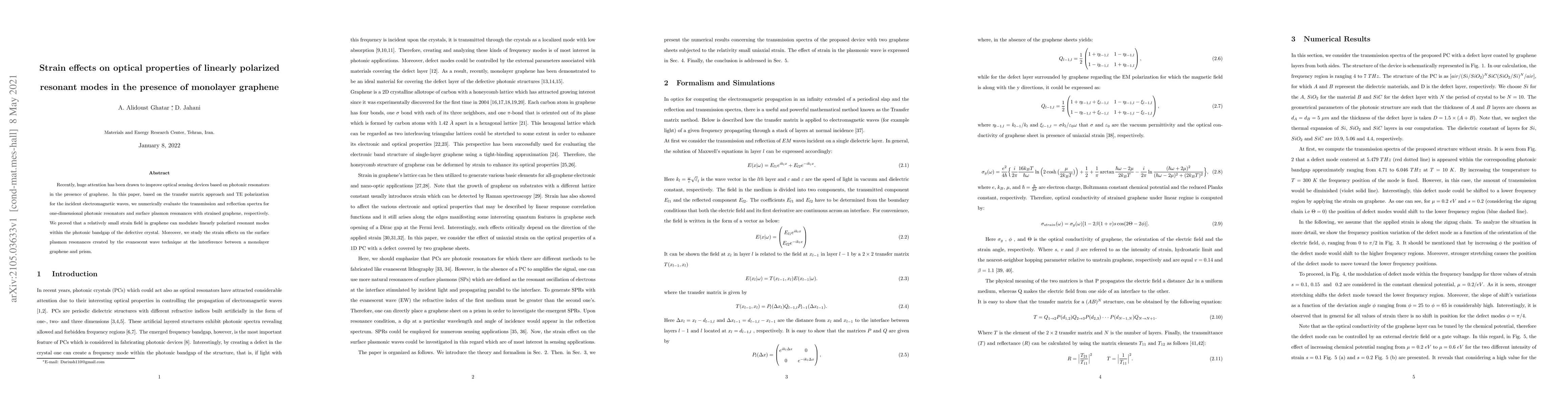This paper investigates how strain affects the optical properties of linearly polarized resonant modes in photonic resonators with monolayer graphene, using the transfer matrix approach. It demonstrates that small strain fields can modulate these modes within the photonic bandgap and influence surface plasmon resonances via evanescent wave interactions.
