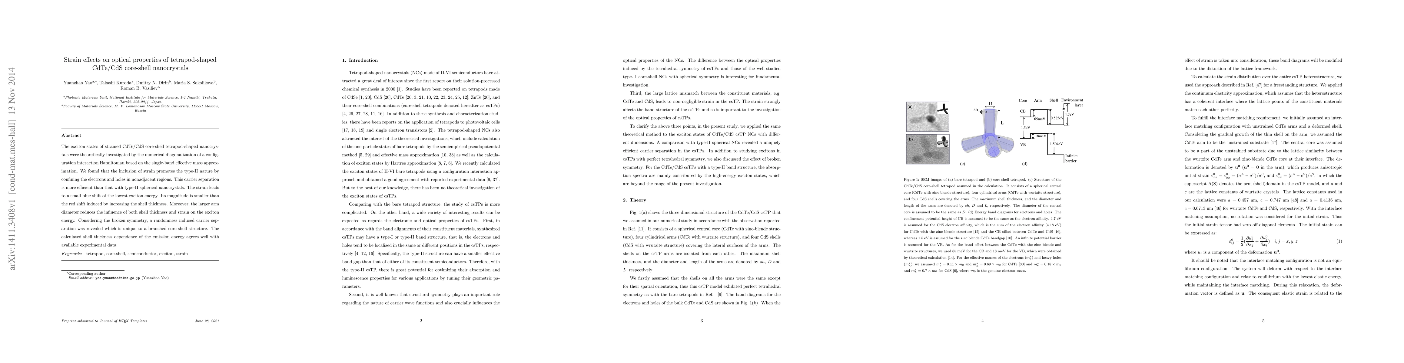 This paper investigates the optical properties of tetrapod-shaped CdTe/CdS core-shell nanocrystals under strain, finding that strain enhances type-II behavior by separating electrons and holes more efficiently than in spherical nanocrystals. The study also reveals a small blue shift in the lowest exciton energy due to strain, with the effect being less pronounced than the red shift from increased shell thickness.