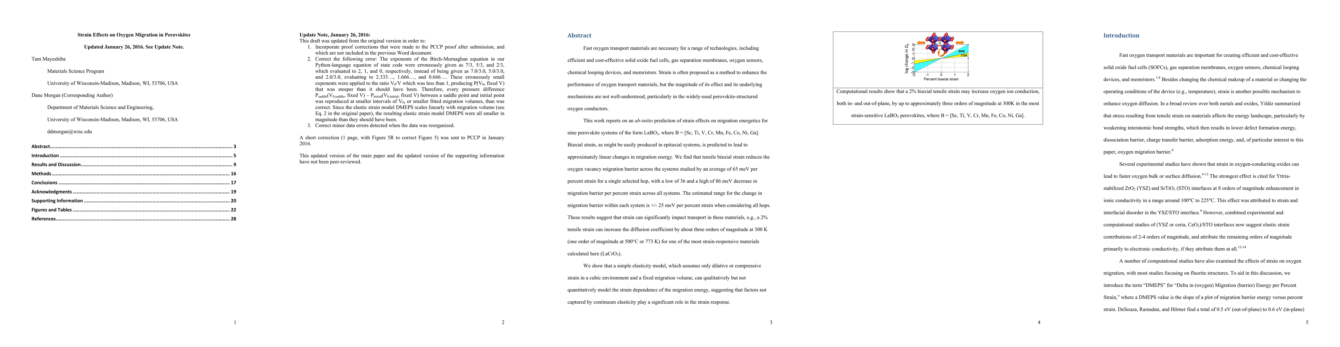This study investigates the impact of strain on oxygen migration in perovskite materials, finding that tensile biaxial strain can significantly lower migration barriers, enhancing oxygen transport. A 2% tensile strain can increase the diffusion coefficient by three orders of magnitude at 300 K, highlighting the potential of strain engineering in improving material performance.