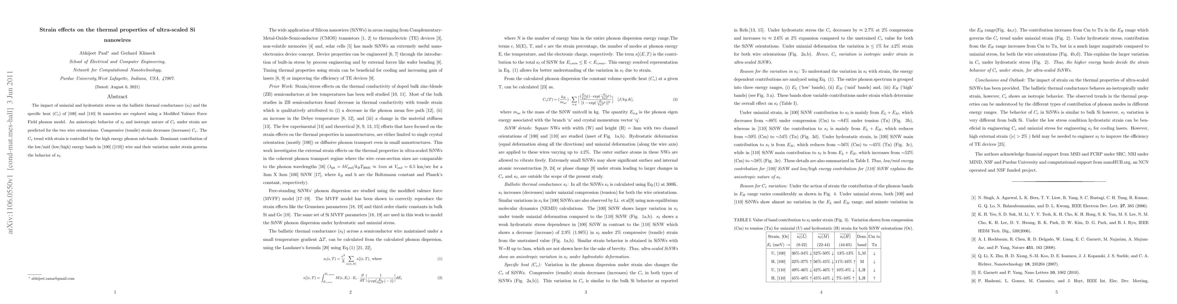 The impact of uniaxial and hydrostatic stress on the ballistic thermal conductance ($\kappa_{l}$) and the specific heat ($C_{v}$) of [100] and [110] Si nanowires are explored using a Modified Valence Force Field phonon model. An anisotropic behavior of $\kappa_{l}$ and isotropic nature of $C_{v}$ under strain are predicted for the two wire orientations. Compressive (tensile) strain decreases (increases) $C_{v}$. The $C_{v}$ trend with strain is controlled by the high energy phonon sub-bands. Dominant contribution of the low/mid (low/high) energy bands in [100] ([110]) wire and their variation under strain governs the behavior of $\kappa_{l}$.
