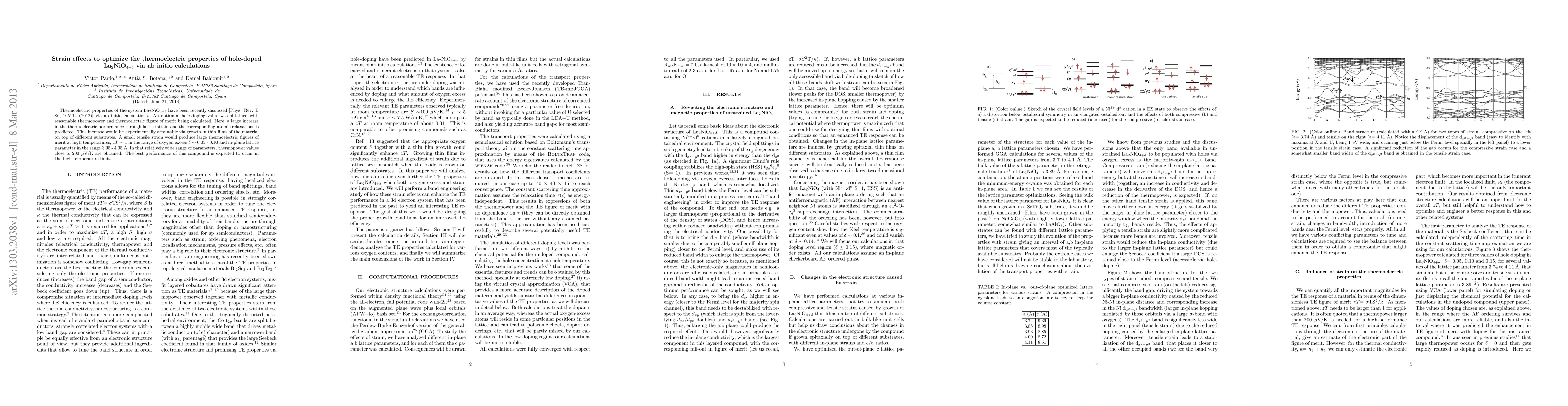 Thermoelectric properties of the system La$_2$NiO$_{4+\delta}$ have been recently discussed [Phys. Rev. B 86, 165114 (2012)] via ab initio calculations. An optimum hole-doping value was obtained with reasonable thermopower and thermoelectric figure of merit being calculated. Here, a large increase in the thermoelectric performance through lattice strain and the corresponding atomic relaxations is predicted. This increase would be experimentally attainable via growth in thin films of the material on top of different substrates. A small tensile strain would produce large thermoelectric figures of merit at high temperatures, $zT$ $\sim$ 1 in the range of oxygen excess $\delta$ $\sim$ 0.05 - 0.10 and in-plane lattice parameter in the range 3.95 - 4.05 \AA. In that relatively wide range of parameters, thermopower values close to 200 $\mu$V/K are obtained. The best performance of this compound is expected to occur in the high temperature limit.