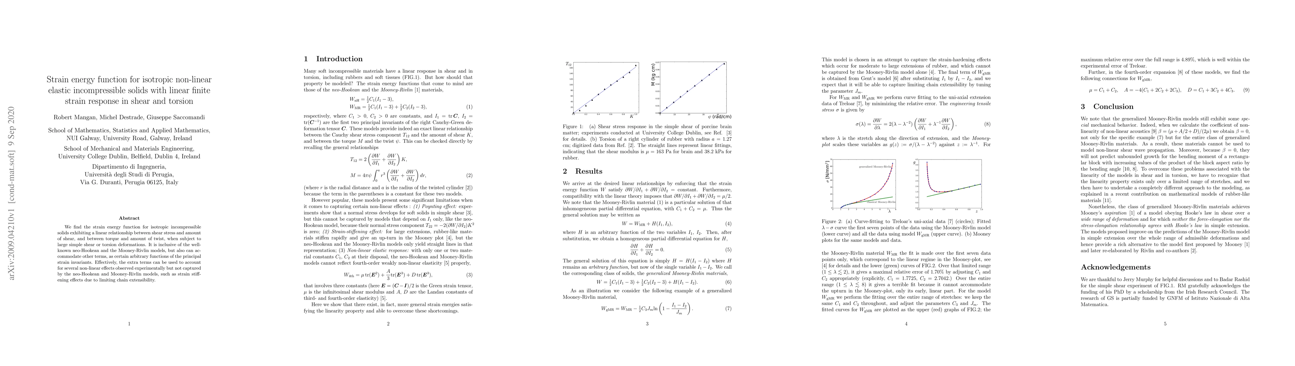 This paper develops a strain energy function for isotropic, incompressible elastic solids that captures linear finite strain responses in shear and torsion, including extensions beyond the neo-Hookean and Mooney-Rivlin models to account for additional non-linear effects like strain stiffening.