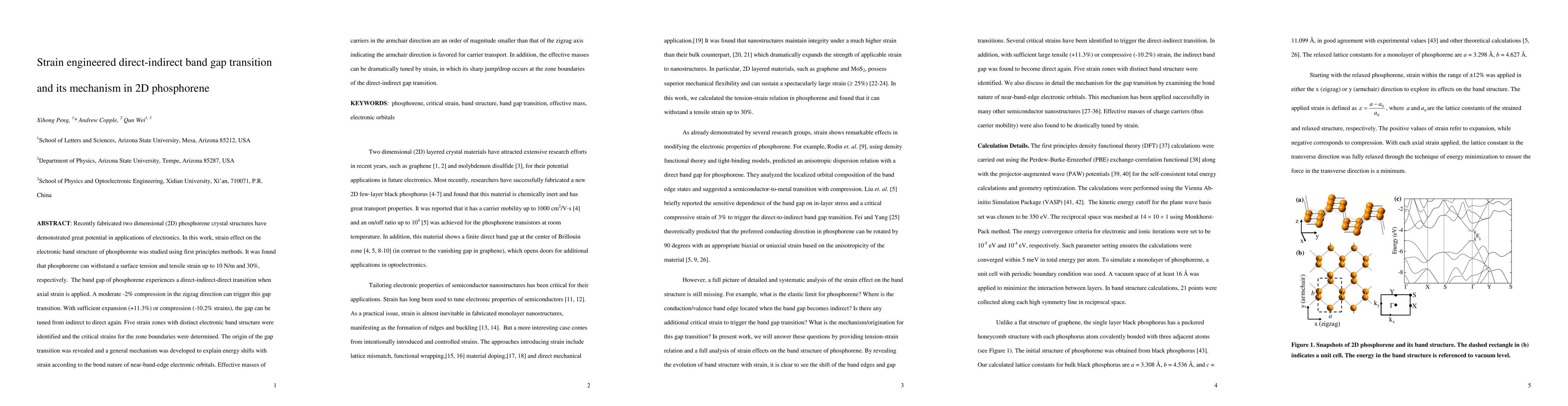 This paper explores the strain-induced direct-indirect band gap transition in 2D phosphorene via first principles calculations, revealing that moderate compression or expansion can tune the band gap and identifying five distinct strain zones. The study also highlights the significant impact of strain on carrier effective masses, with the armchair direction favoring carrier transport.