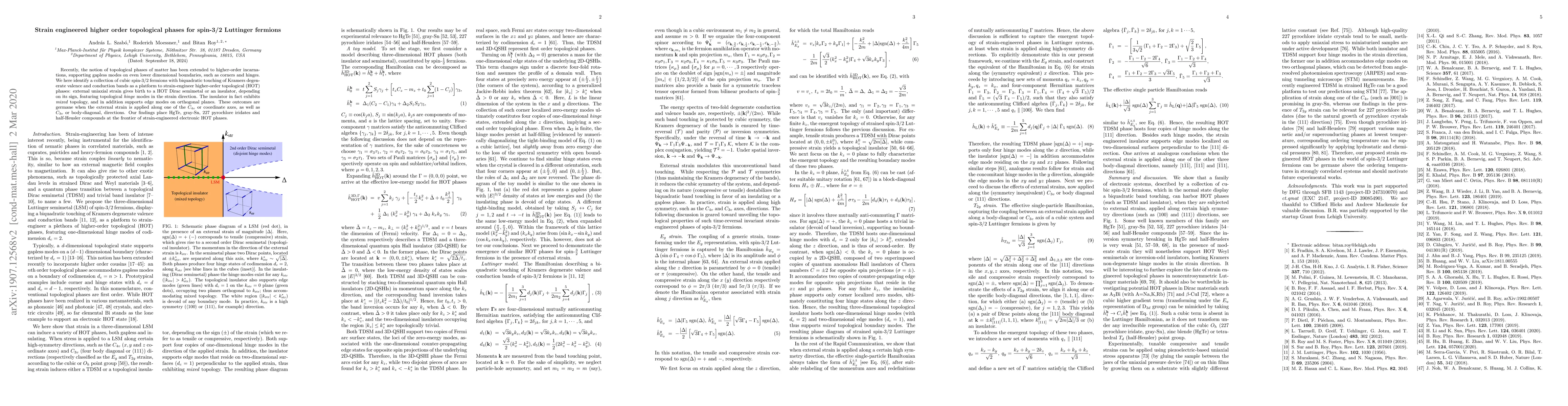Recently, the notion of topological phases of matter has been extended to higher-order incarnations, supporting gapless modes on even lower dimensional boundaries, such as corners and hinges. We here identify a collection of cubic spin-3/2 fermions with biquadratic touching of Kramers degenerate valence and conduction bands as a platform to strain-engineer higher-order topological (HOT) phases: external uniaxial strain gives birth to a HOT Dirac semimetal or an insulator, depending on its sign, featuring topological \emph{hinge} modes in the strain direction. The insulator in fact exhibits \emph{mixed} topology, and in addition supports edge modes on orthogonal planes. These outcomes are germane when the external strain is applied along one of the $C_{4v}$ or coordinate axes, as well as $C_{3v}$ or body-diagonal, directions. Our findings place HgTe, gray-Sn, 227 pyrochlore iridates and half-Heusler compounds at the frontier of strain-engineered electronic HOT phases.