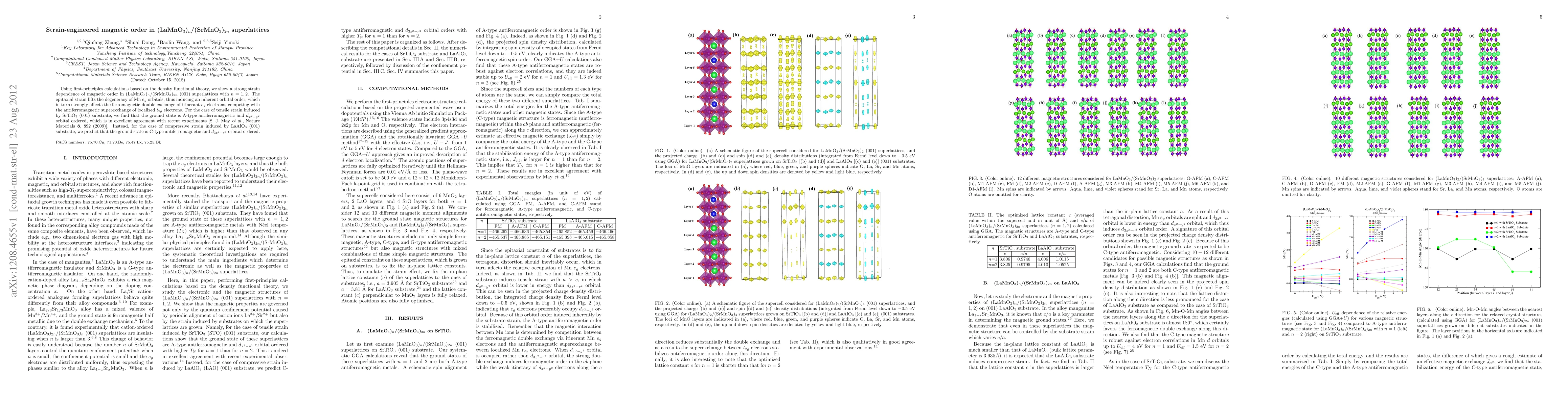 This research demonstrates that strain significantly influences magnetic order in (LaMnO$_{3}$)$_n$/(SrMnO$_{3}$)$_{2n}$ superlattices, with tensile strain leading to A-type antiferromagnetism and $d_{x^2-y^2}$ orbital order, while compressive strain results in C-type antiferromagnetism and $d_{3z^2-r^2}$ orbital order, as predicted by density functional theory calculations.