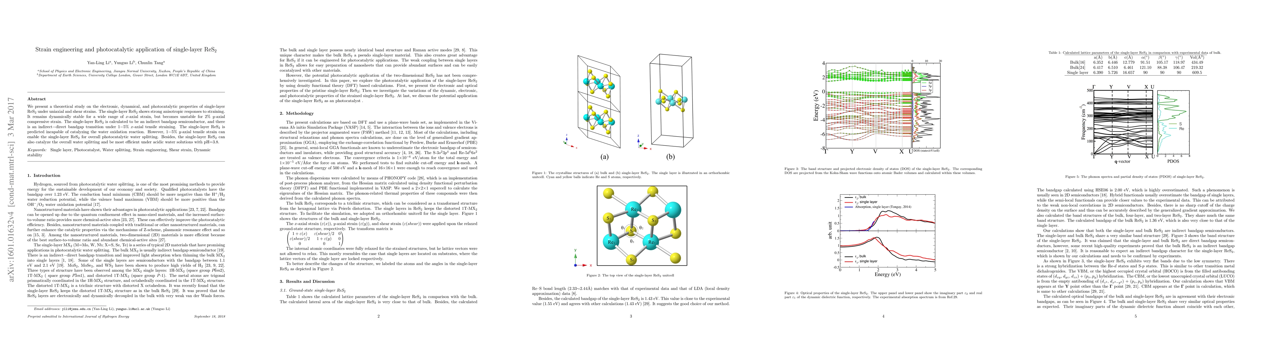 We present a theoretical study on the electronic, dynamical, and photocatalytic properties of single-layer ReS$_2$ under uniaxial and shear strains. The single-layer ReS$_2$ shows strong anisotropic responses to straining. It remains dynamically stable for a wide range of $x$-axial strain, but becomes unstable for 2\% $y$-axial compressive strain. The single-layer ReS$_2$ is calculated to be an indirect bandgap semiconductor, and there is an indirect$-$direct bandgap transition under 1$-$5\% $x$-axial tensile straining. The single-layer ReS$_2$ is predicted incapable of catalyzing the water oxidation reaction. However, 1$-$5\% $y$-axial tensile strain can enable the single-layer ReS$_2$ for overall photocatalytic water splitting. Besides, the single-layer ReS$_2$ can also catalyze the overall water splitting and be most efficient under acidic water solutions with pH=3.8.