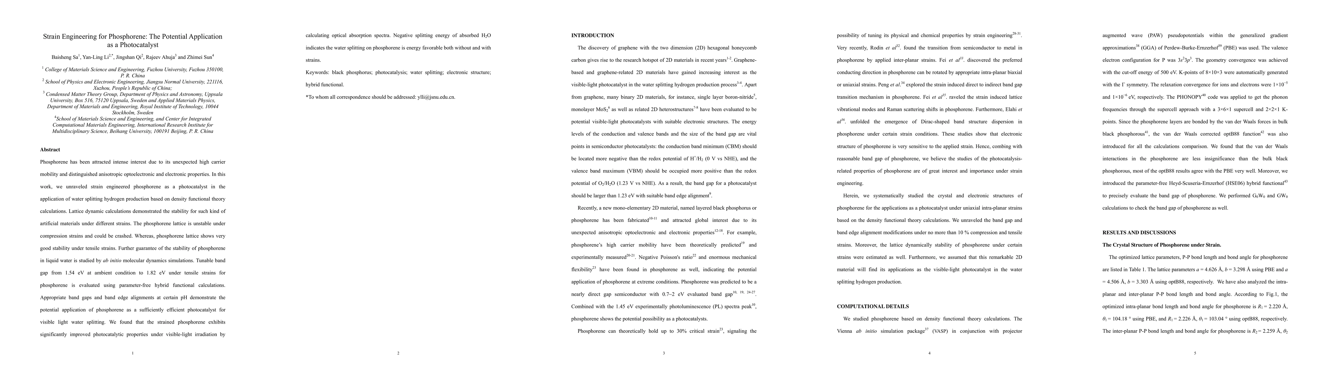This study investigates the potential of strain-engineered phosphorene as a photocatalyst for hydrogen production via water splitting, revealing that tensile strains enhance its stability and tunable band gap, making it efficient under visible light. The research confirms that phosphorene's photocatalytic properties significantly improve under strain, with favorable energy conditions for water splitting.